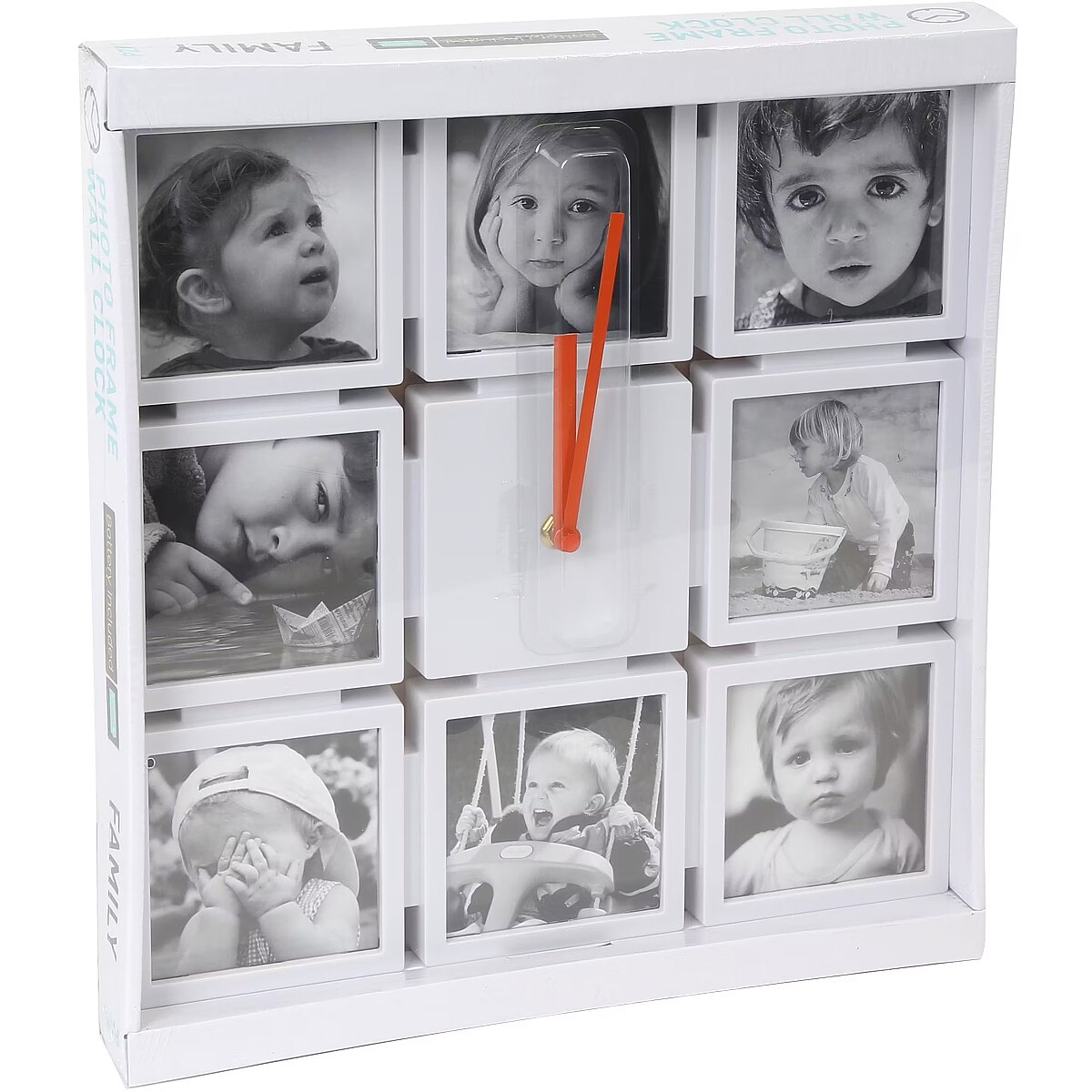 description_lv - Stylish wall clock and photo frame in one. Fits up to eight photos and uses one AA battery as a power source (included). Made of extra durable plastic.