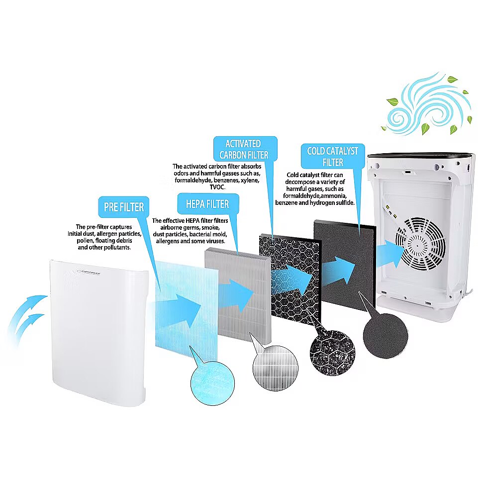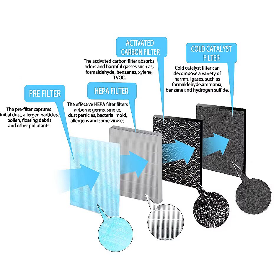 4-stage filter includes the pre-filter, activated carbon filter , HEPA filter (H11) and cold catalyst filter.