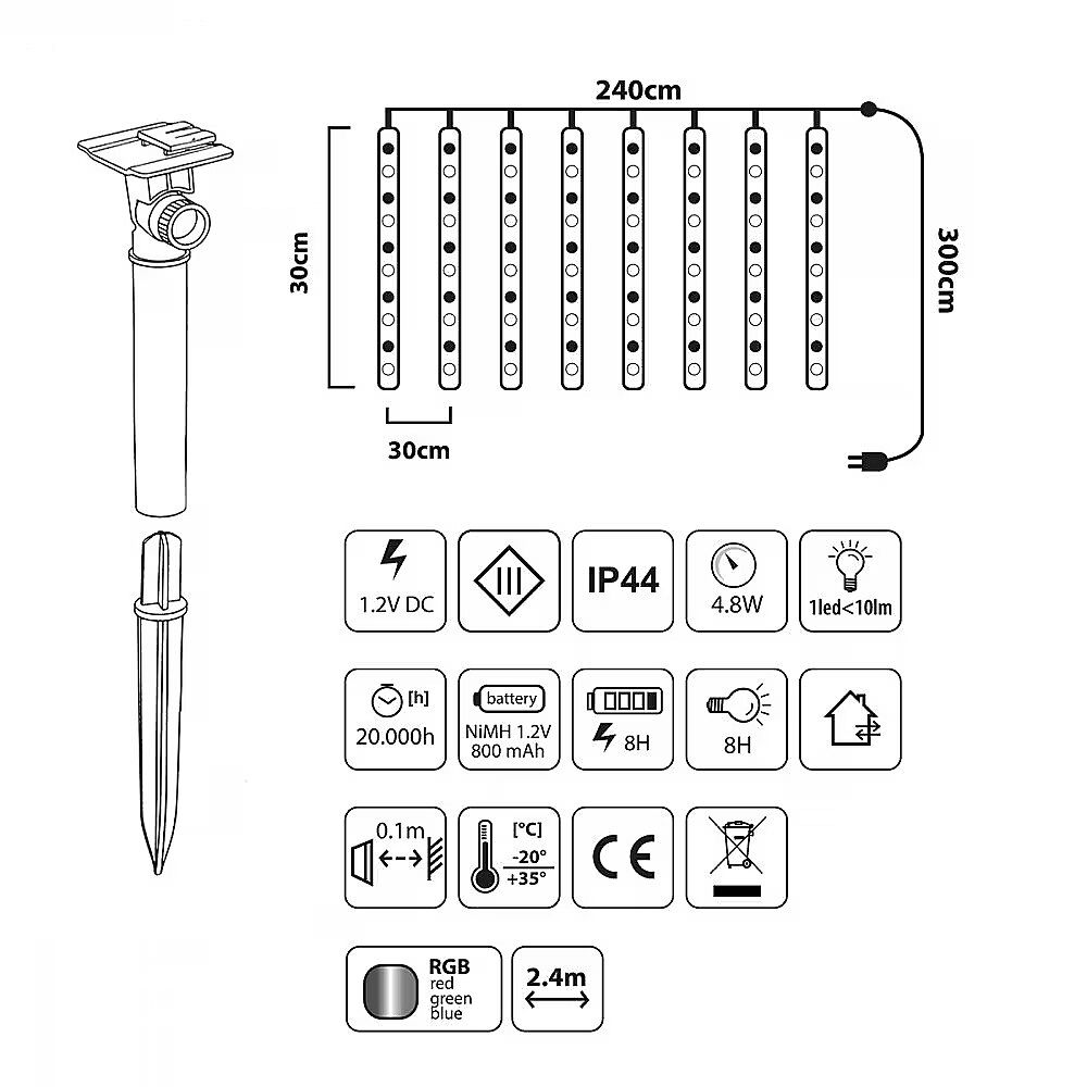 Dimensions - Liczba diod: 144 LED RGB Długość przewodu: 2,4 m (całkowita długość z przewodem zasilającym: 3m)