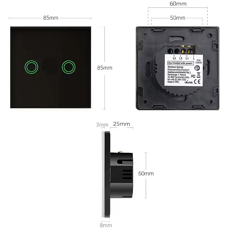 Apraksts - Wysokiej jakości podwójny, dotykowy włącznik z podświetleniem LED Maclean MCE704B Nowoczesna alternatywa dla konwencjonalnych włączników światła, która nada Twojemu wnętrzu nowy, elegancki wygląd. Panel wykonany z twardego, hartowanego szkła jest odporny na zarysowania i łatwy w czyszczeniu. Włącznik jest wodoodporny, dzięki czemu może być zamontowany w pomieszczeniach o zwiększonej wilgotności, jak kuchnia lub łazienka. Kolorowe podświetlenie LED pozwala na zlokalizowanie włącznika w ciemności.