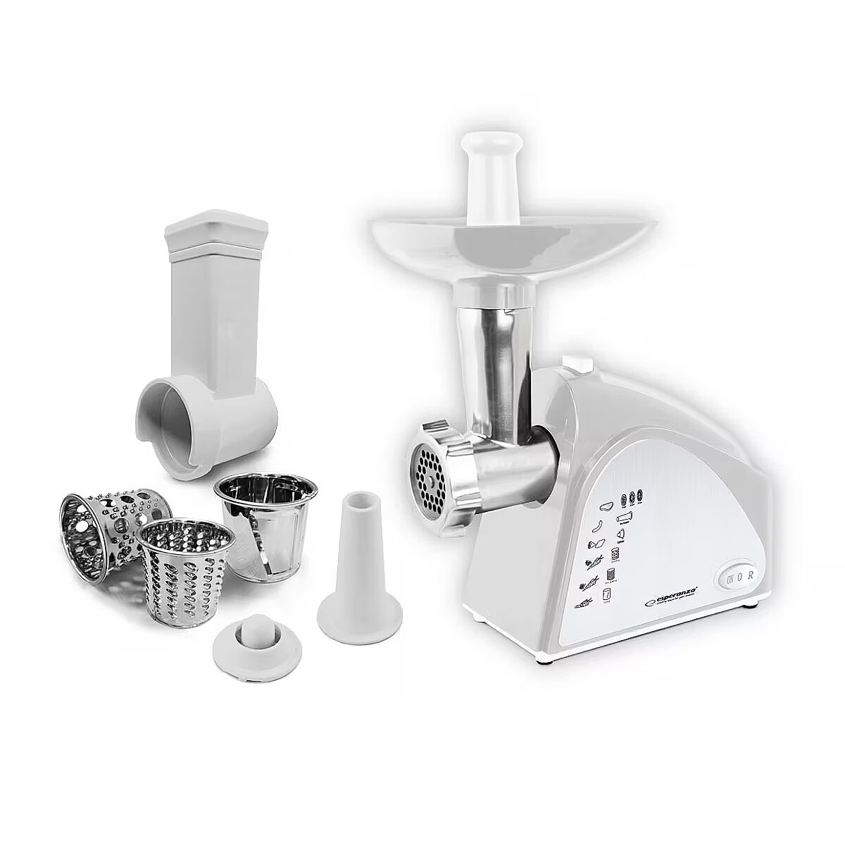 Description - The Esperanza RISSOLE meat grinder with slicer is a modern and functional device that will be very useful in every home kitchen. The device in the "grinder" function will very easily grind not only meat, but also other food products, and additional attachments will allow you to make sausages or "kebbe". During the "shredder" function, Esperanza RISOLLE is perfect for chopping fruit, vegetables, hard cheese, chocolate, nuts or preparing crumbles. Anti-slip rubber feet guarantee stable and safe operation of the device. maximum power: 2200 W stainless steel knife with long service life metal worm drive 3 grinding disc strainers with different hole diameters: 3.0mm 5.0mm 7.0mm forward and reverse movement function nozzle for making sausages nozzle for kneading kebbe balls 3 different shredding drums non-slip rubber inserts ensuring stable operation of the device net weight: 2.49 kg product dimensions: 27.5 x 13.5 x 35.0 [cm] power cord length: approx. 85 cm power supply: 230V, 50Hz