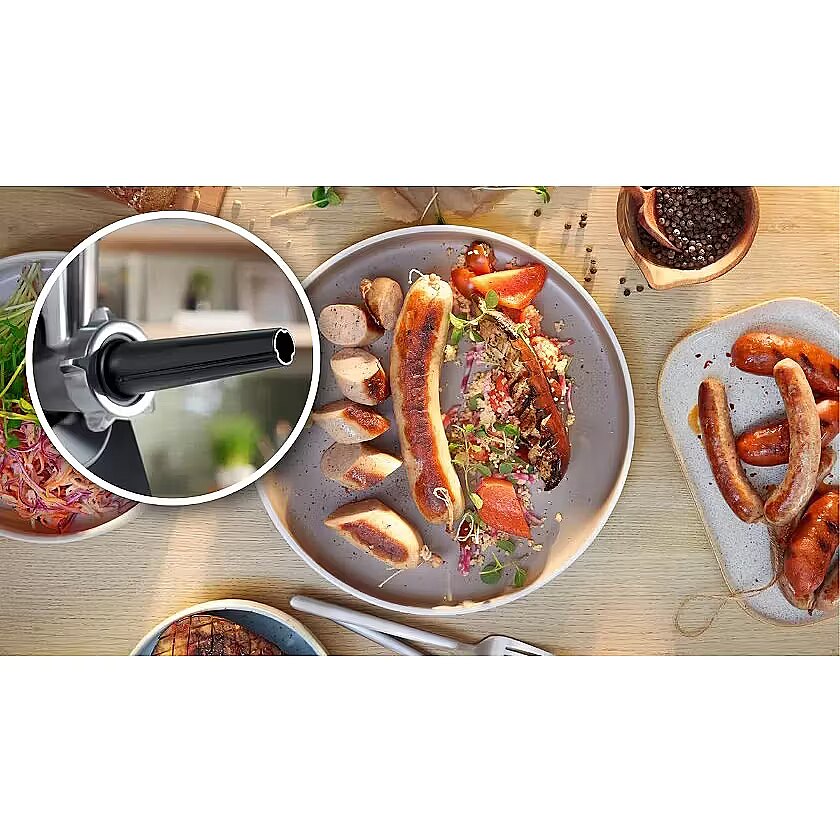 Description - Sekret wysokiej wydajności Przekładnia planetarna zapewnia wytrzymałość i stabilność urzadzenia, gwarantując przy tym wysoką wydajność nawet przy intensywnym użytkowaniu. Pozwala na przeniesienie dużej mocy przy zachowaniu niewielkich rozmiarów urządzenia. Zapewnia wysoką precyzję działania i skuteczność w przetwarzaniu różnego rodzaju składników. Płynna obsługa dzięki unikatowemu pokrętłu Pokrętło sterujące zapewnia łatwy wybór między dwiema prędkościami. Funkcja REVERSE czyli bieg wsteczny pomoże uwolnić skladniki na wypadek zablokowania ich w komorze mielenia (np. podczs mielenia mięsa przeplatanego żyłkami tłuszczu i włóknami mięśniowymi). Inteligentne rozwiązania - nieplączący się kabel i sita zawsze na swoim miejscu Sita można wygodnie przechowywać w zintegrowanym schowku na górze urządzenia, beda zawsze pod ręką. Schowek na kabel zwiększa kompaktowość całej konstrukcji i ułatwia przechowywanie maszynki do mielenia. Wtyczkę również ukryjesz w obudowie co ułatwi dostawienie maszynki do ściany. Stabilność na blacie dzięki przemyślanej konstrukcji Maszynka do mielenia, który porusza się po powierzchni roboczej, może być zagrożeniem dla naszego bezpieczeństwa. Dzięki gumowym nóżkom w podstawie urządzenia maszynka marki Bosch jest stabilnie umiejscowiona na blacie. Mocny a jednocześnie delikatny sposób na uzyskanie świeżego soku z miękkich owoców i warzyw Przygotowanie domowego soku pomidorowego często wymaga dużego wysiłku. Dzięki wyciskarce do miękkich owoców i warzyw łatwo przygotujesz zdrowe soki i przeciery w swoim domu. Wyciskarka przetwarza wiele rodzajów owoców i warzyw: od owoców jagodowych po miękkie warzywa jak np. pomidory. Ba, usuwa nawet łodyżki z porzeczek! Mocny silnik do przetwarzania dużych ilości pożywienia Dzięki mocnemu silnikowi o mocy zblokowania silnika 1900W składniki przetwarzane są równomiernie i szybko. Wydajność 2,5 kg mięsa na minutę sprawia, że urządzenie poradzi sobie z każdym wyzwaniem. Dłuższa żywotność nożyka Zwykle maszynki do mielenia mają tylko jednostronny nożyk. Nóż dwustronny ze stali nierdzewnej w maszynkach marki Bosch posiada ostre krawędzie z dwóch stron. Nie musisz więc koncentrować się już na tym czy zakładasz nożyk prawidłowo. Niezależnie z której strony go założysz - zawsze będzie dobrze! Nóż jest idealnie dopasowany, równomiernie rozdrabnia mięso i warzywa oraz jest łatwy w montażu i czyszczeniu. Domowe wyroby są zawsze dobrą alternatywą dla tych kupowanych w sklepie Domowe kiełbaski mogą być przygotowane według Twojego indywidualnego gustu i przepisu. Napewno zachwycą Twoich gości. Przystawka masarska umożliwia tworzenie własnych, pysznych kiełbasek drobiowych, wołowych, wieprzowych czy wegetariańskich. Dania orientalne na wyciągnięcie ręki Możesz przygotować kebbe nawet jeśli nie masz zbyt wiele czasu. Nasadka ma na celu ułatwienie procesu przygotowania tego orientalnego przysmaku. Przy pomocy nasadki uformujesz długie rurki z mięsa, które wypełnisz ulubionym farszem. Twałe materiały zapewniają długą żywotność urządzenia Wytrzymały materiał z którego zostały wykonane komora mielenia, ślimak i metalowe sprzęgło w połączeniu z najnowszą technologią zapewniają długotrwałą wysoką jakość maszynki do mielenia MultiPower.