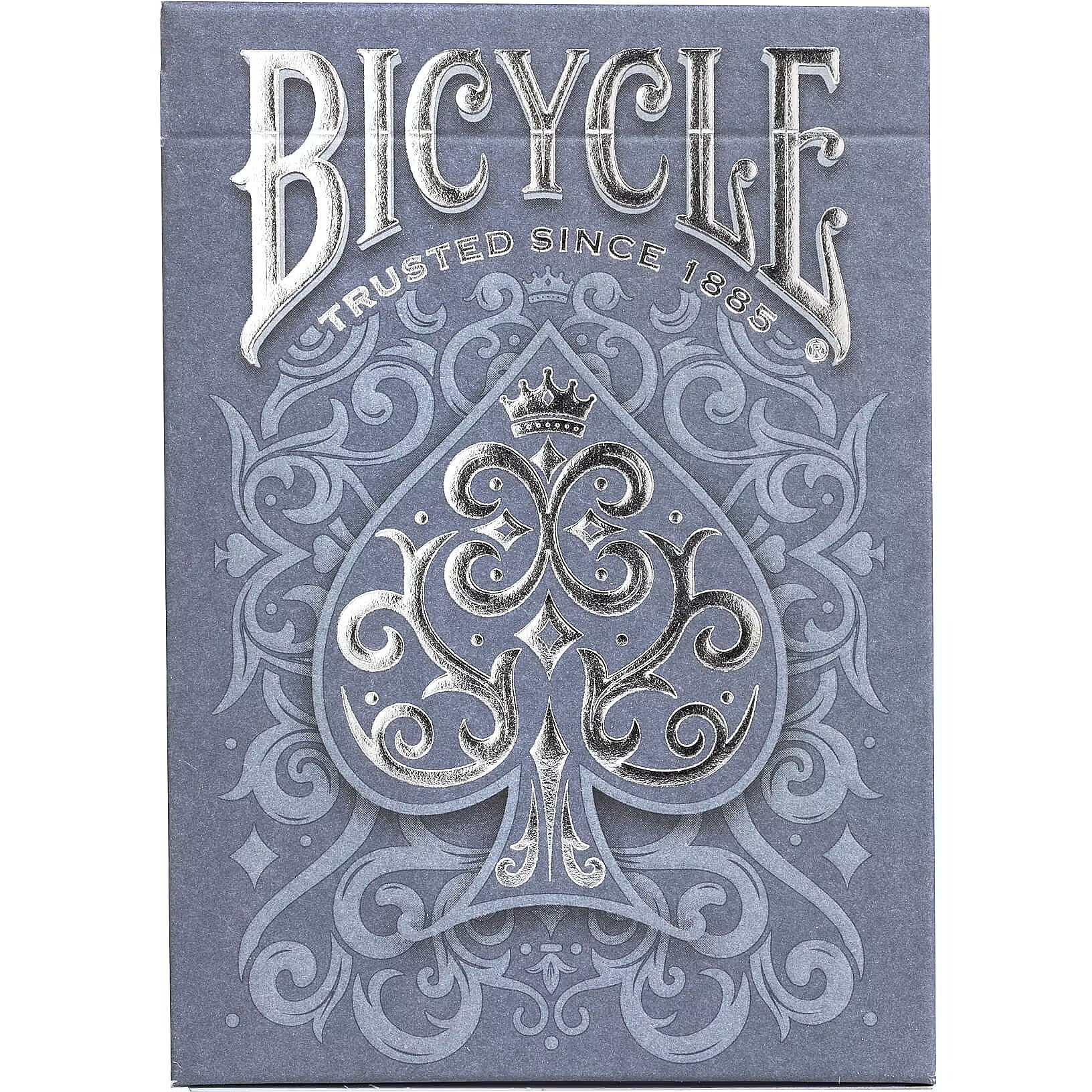 Description - Bicycle Cinder is inspired by the elegant and mysterious smoke of a bonfire. The deck design features various shades of ash gray and features shiny silver foil with two levels of embossing for a 3D effect. Also includes a custom locking seal. The figures are in warm, golden colors, representing glowing coals from which smoke rises.