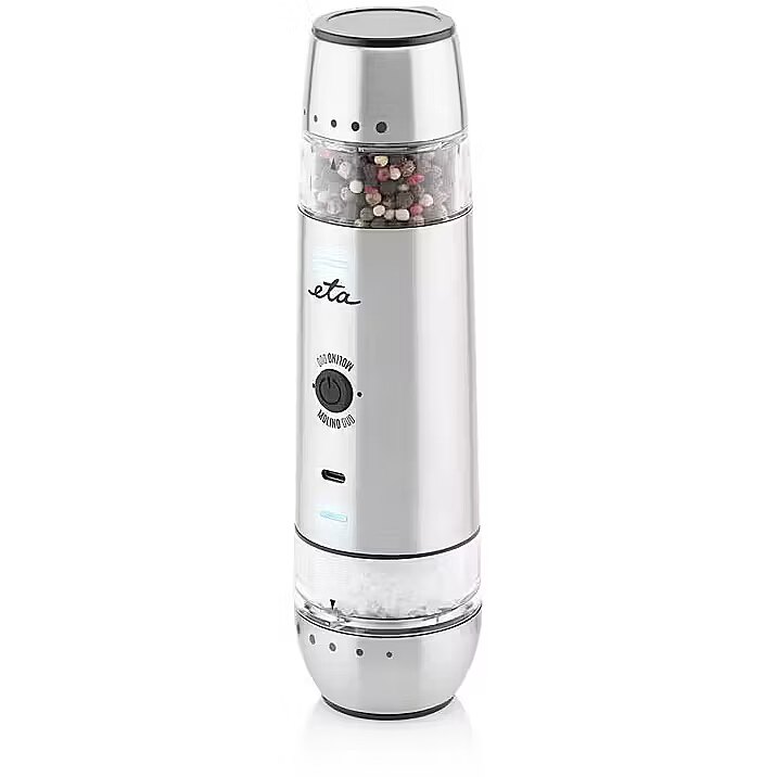 Tehniskie dati: Papildu informācija - malšanas biezuma regulēšanadarba un uzlādes indikatorsdivas atsevišķas sāls un piparu tvertnesUSB kabelis komplektāuzlāde līdz 4 stundām.