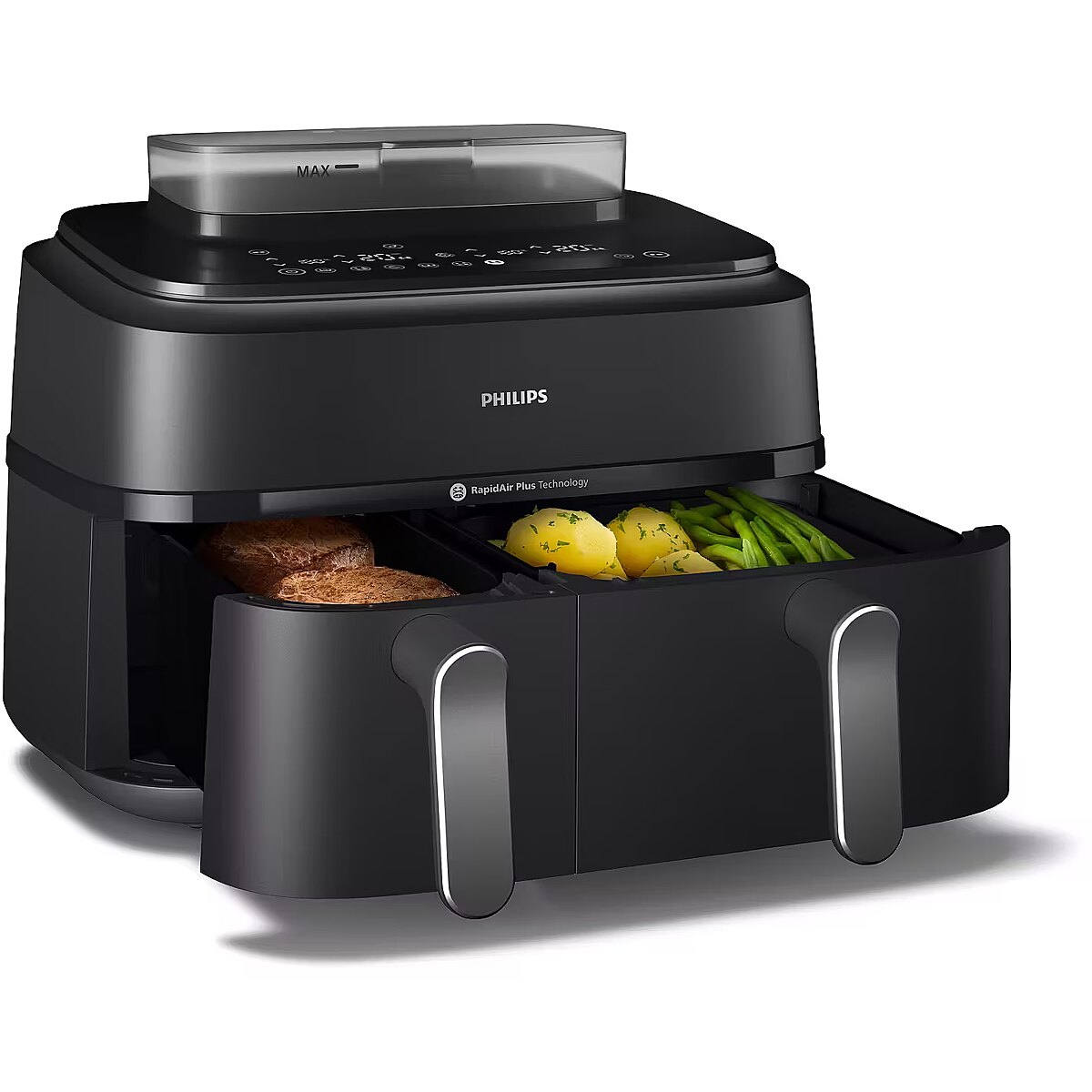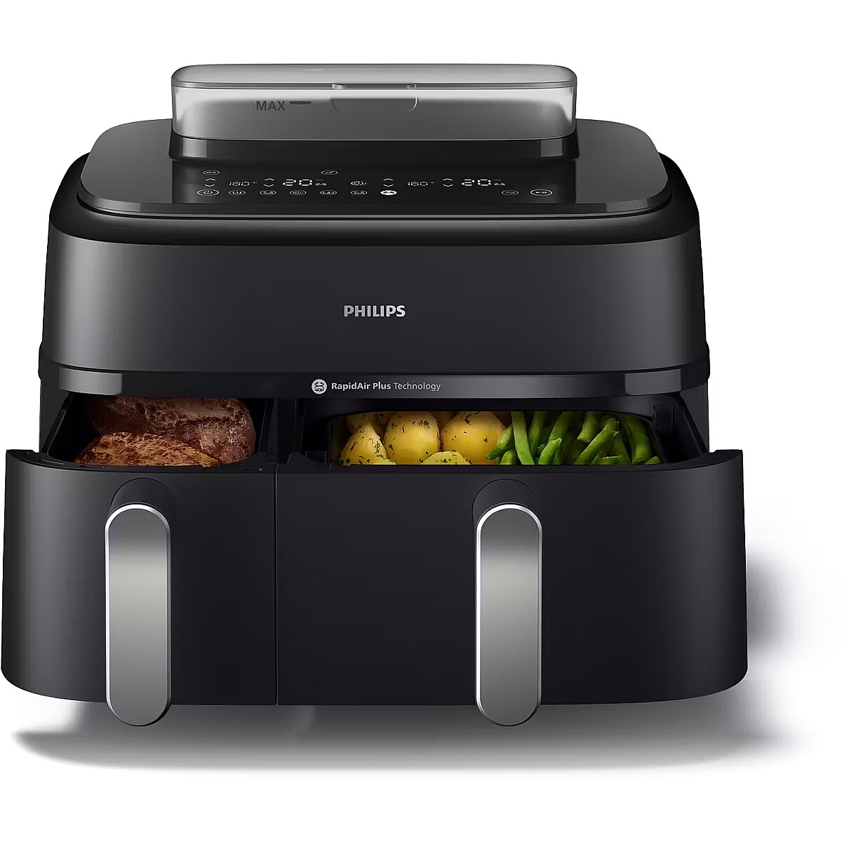 description_lv - Karstā gaisa fritieri ar diviem groziem un tvaicēšanu. Divi grozi cepšanai, cepšanai cepeškrāsnī, grilēšanai un cepšanai; viens ir piemērots tvaicēšanai. Izmanto RapidAir Plus un Air Steam tehnoloģijas, lai nodrošinātu kraukšķīgus, vienmērīgi pagatavotus ēdienus, vienlaikus saglabājot uzturvielas. RapidAir Plus ar zvaigžņveida plūsmas dizainu nodrošina efektīvu karstā gaisa cirkulāciju; 9 litru ietilpība ar 6 litru grozu pamatēdieniem un 3 litru grozu piedevām (līdz 1100 g frī kartupeļiem, 1600 g dārzeņiem, 1,2 kg veselas vistas). Automātiska gatavošanas laika sinhronizācija visos grozos. Air Steam nodrošina maigu, mitru tekstūru, vienlaikus saglabājot līdz pat 87% vairāk uzturvielu salīdzinājumā ar vārīšanu. Steam Clean vienkāršo tauku atlikumu tīrīšanu. Saderīgs ar HomeID lietotni pielāgotām receptēm. Gatavo līdz pat 40% ātrāk un patērē līdz pat 80% mazāk enerģijas nekā cepeškrāsns. Plaša lietotāju apmierinātība. Specifikācijas: 2300–2750 W, 220–240 V, 50 Hz; 40–200 °C; LED skārienekrāns ar 12 iepriekš iestatītiem iestatījumiem un 19 gatavošanas režīmiem; 60 minūšu taimeris; automātiska izslēgšanās; mazgājams trauku mazgājamā mašīnā, nepiedegošs pārklājums; svars ~8,75 kg; izmērs aptuveni 444 × 383 × 355 mm.