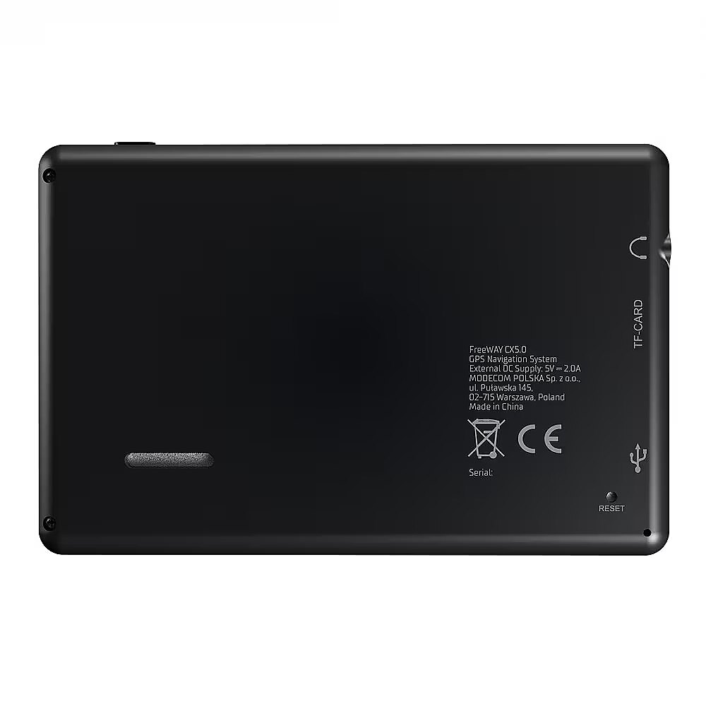 Description - We share years of experience The compact, five-inch MODECOM FreeWAY CX5.0 navigation was created based on our many years of experience. We have prepared a product with a modern, transparent and intuitive menu, which is a natural evolution of the popular FreeWAY SX2 model. Capacitive touch panel work like on a smartphone The navigation is equipped with a capacitive touch panel. This means that the screen works by touching with a finger, not a stylus. The use of a touch panel makes navigation much easier - you don't have to look for a stylus to enter the desired route. You work as you would on a smartphone. Compact navigation 5 The size 5 TFT display with a resolution of 800 x 480 pixels allows you to keep the device compact. Good colors, wide viewing angles, bright image all make navigation easier. The screen is characterized by high detail, and the resolution used is most common in seven-inch models. Perfect on the road and in the city Modecom Freeway CX5.0 car navigation is a proposition for every driver, both for endless wilderness and the thicket of city streets. Location precision. MSTAR GPS chip. The device is equipped with a high-class and sensitive MSTAR GPS system. Thanks to this GPS module, the device precisely determines the route and ensures optimal precision of the location of the vehicle and the destination point. Fast RAM Modern software requires advanced and reliable device components. The navigation is equipped with 256 megabytes of RAM, which is an optimal solution for most navigation programs. Strong grip The navigation is made of high-quality materials. Thanks to this, you can be sure that it will serve for many years. The same applies to the navigation holder (available in the set), which securely holds the screen, protecting it from damage.