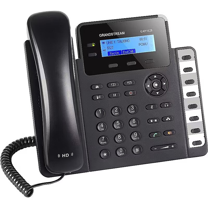 Description - Phone IP GXP 1628 HD The GXP1628is a standard Grandstream IP phone for small businesses. The model runs under Linux and comes with two lines of support, three programmable XML keys, 8 programmable BLF keys, HD audio, and 3 conference calls. The 132 x 48-pixel LCD screen with excellent image quality is handy to handle. The GXP1628 is equipped with two 10/100/1000 Mbps ports and additionally features PoE. With additional features such as support for multiple interface languages, Plantronics headset EHS (Electronic toggle switch) and call waiting, the GXP1628 is a high quality, easy-to-use and reliable IP phone.
