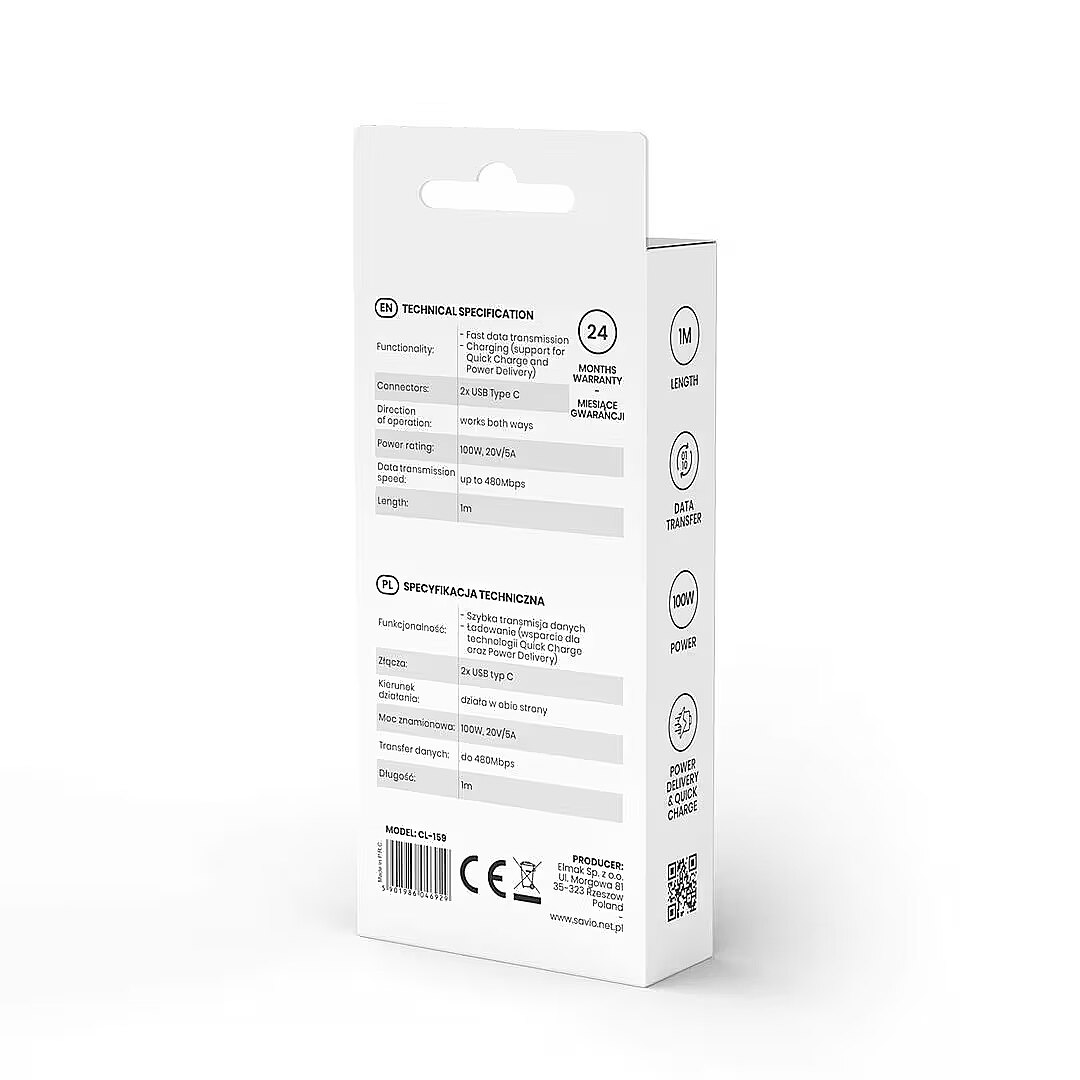 Description - Functionality: Fast data transmission Charging (support for Quick Charge and Power Delivery) Specification: Plugs: 2x USB Type C Direction of operation: works both ways Power: 100W, 20V/5A Data transmission: up to 480Mbps Length: 1m Warranty: 24 months Application examples: Connection of tablet, smartphone or navigation to a charger, computer for charging or data transfer, charging of notebook equipped with USB type C plug.