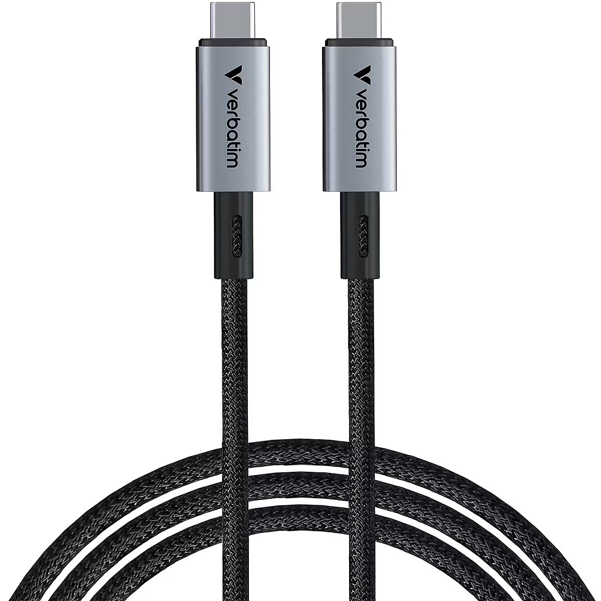 LongDesc - Unmatched Speed and Power Designed for high-performance devices, the Verbatim Sync & Charge USB-C® to USB-C® USB4 Cable delivers ultra-fast charging and data transfer. Whether you're working with demanding applications or transferring large files, this cable offers unmatched speed and power, making it ideal for the latest USB-C devices.Superfast Charging and Data TransferSupporting PD 3.1 charging up to 240W, this cable powers even the most demanding devices quickly and efficiently. It offers data transfer speeds of up to 40Gbps, ensuring rapid file transfers and seamless device synchronisation for work or play. Transfer large files, 4K/8K videos, and more in seconds.Durable and High-Performance DesignFeaturing a braided nylon exterior, reinforced metal alloy connectors and toughened aramid fibre core, this cable is built to last. It has passed rigorous testing, enduring over 30,000 bends, ensuring it can withstand daily wear and tear while maintaining peak performance.