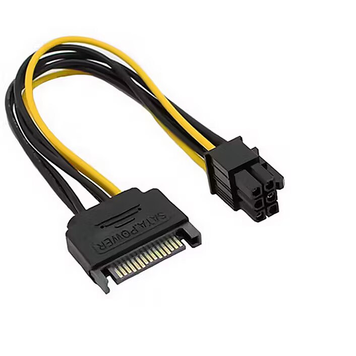 description_en - This 20cm SATA 15pin to 6pin PCIe adapter cable is designed for video cards, enabling the use of a SATA power supply when a 6pin PCIe power connection is unavailable. Product Name: SATA 15-Pin to 6-Pin PCIe Adapter CableLength: 20cmWeight: 40gFunction: Power supply