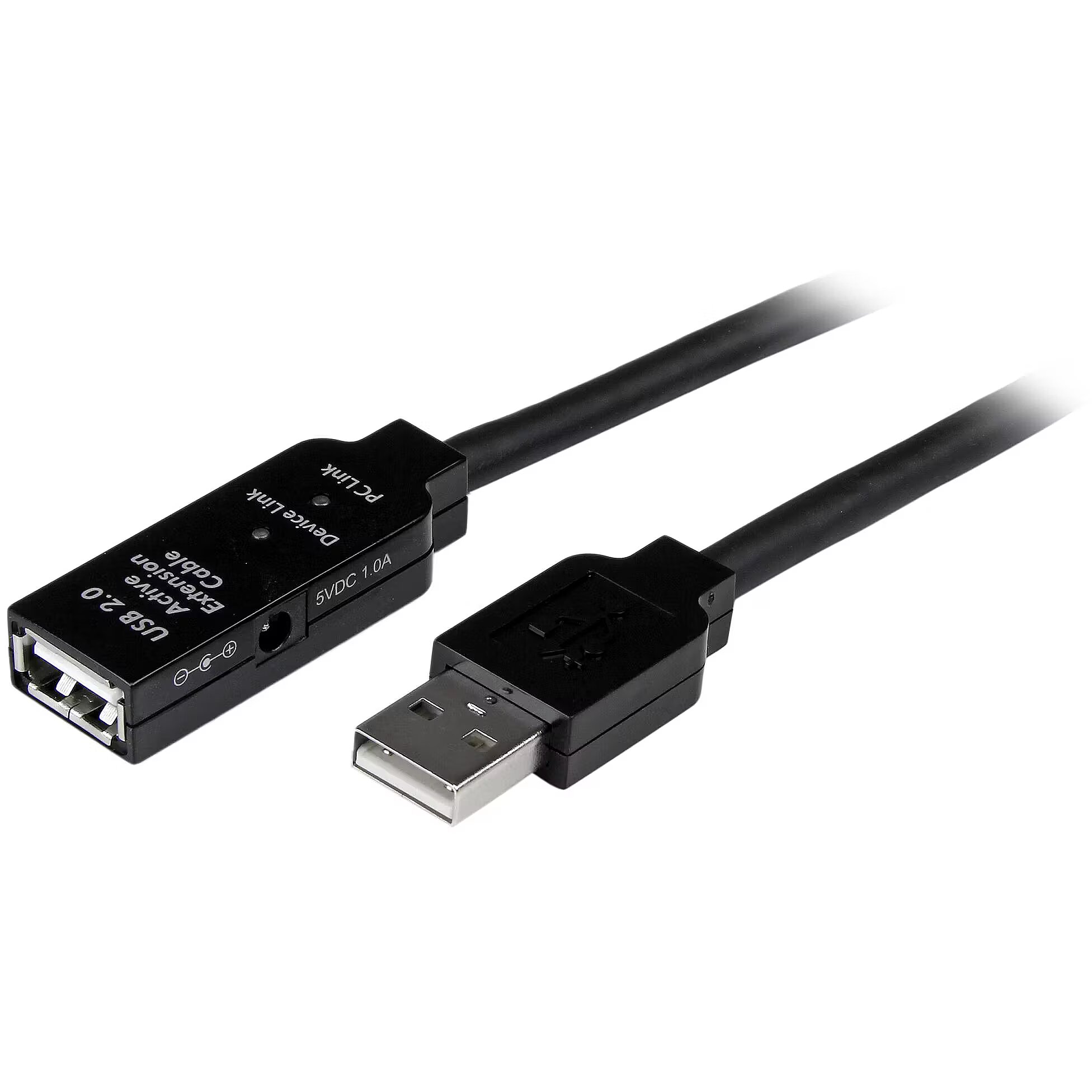 LongDesc - Extend the distance between a computer and a USB 2.0 device by 15 metersThe USB2AAEXT15M 15m Active USB 2.0 Extension Cable, offers one USB 'A' male connector and one USB 'A' female connector, and provides an active extension of USB 2.0 devices of up to 15-meters (49.2-feet).An all-in-one cable for overcoming distance restrictions as well as power source limitations, the active USB 2.0 extension cable incorporates bus-powered active circuitry to ensure performance beyond the length limits of standard USB cables. Up to 4 of these cables can be daisy-chained together, allowing for a total USB extension of up to 60-meters. If necessary, the USB device can be powered from a wall outlet using the Universal AC power adapter (provided with the cable).The USB2AAEXT15M repeater cable supports the full USB 2.0 bandwidth of 480 Mbps, and is backed by StarTech.com's 2-year Warranty.The StarTech.com Advantage- No USB signal loss, even at a distance of up to 49.2 feet (15 meters)- Power your USB devices directly from the USB port or through the included universal external power adapter- Daisy chain up to 4 cables together for reaching connection distances of up to 60-meters between your USB 2.0 devices