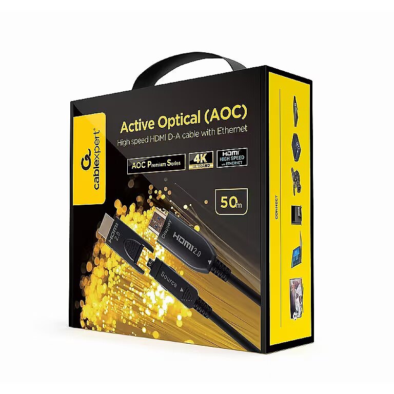Apraksts - AOC ātrgaitas HDMI kabelis ar eternetu 50 m ar D/A adapteri HDMI aktīvais optiskais kabelis (AOC) izmanto optisko šķiedru tehnoloģiju digitālā HDMI signāla pārraidei. Tas nozīmē, ka signālu var pārnest daudz tālāk nekā izmantojot tradicionālo vara kabeli (līdz 100 m) un samazina EMI/ RFI traucējumu risku. AOC HDMI kabeļiem ir arī īpaši vara vadi, tāpēc nav nepieciešams ārējs barošanas avots. HDMI AOC kabeļos izmantota optiskās šķiedras tehnoloģija - tā samazina EMI/RFI traucējumu risku vidē ar augstu traucējumu līmeni. Izturīgs, īpaši plāns, augstas kvalitātes pīts kabelis ar kontakta metāla savienotājiem. Mazāks kabeļa diametrs salīdzinājumā ar tradicionālajiem vara HDMI kabeļiem. Atbalsta 4K UHD izšķirtspēju ar 60 Hz.