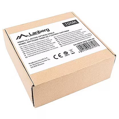 Description - HDMI M/M V2.1 CABLE 100M 8K BLACK OPTICAL AOC LANBERG HDMI optical cables allow for lossless transmission of audio-video signals over vast distances. Thanks to the use of optical fibre as a conductor, they are extremely thin, which facilitates cable routing, additionally ensuring resistance to electromagnetic interference. The latest HDMI 2.1 (Ultra High Speed) standard allows the transmission of 8K quality video at a refresh rate of 30 Hz. Using DSC (Display Stream Compression) technology, the resolution can be increased up to a maximum of 10K! NOTE Due to its design, an optical HDMI cable only transmits video in one direction. Please pay attention to the markings on the connectors in order to connect the product correctly.