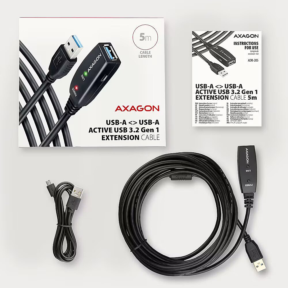 LongDesc - Active extension AXAGON ADR-305 USB 3.2 Gen 1 cable 5 m long. Ideal for connecting your computer to a USB device such as a mouse, keyboard, webcam, printer, scanner, plotter and others. The active USB repeater cable strengthens the passing USB signal and allows you to connect a significantly more distant USB device than the usual 5 meters when passive cables are used. The range of the cable can be further extended by using several cables in a row. Thanks to the used USB 3.2 Gen 1 (formerly USB 3.0) interface, you can enjoy a data transfer speed of up to 5 Gbps. So, you can use the cable for devices that require higher speed, such as backup systems, NAS data storage and others. A great advantage of the ADR-305 extension is an integrated auxiliary power supply connector. In most cases, USB bus power is sufficient, but for devices with larger power consumption the USB power supply may be inadequate and auxiliary power from the mains may resolve the problem. The remarkably compact body of the AXAGON repeater allows for trouble-free use in electrical installation strips or cable systems. The use of a high-quality shielded cable ensures high communication speed and minimal undesirable interference. Input:• USB 3.2 Gen 1 for connection to a computer• USB Type A (M) male connectorOutput:• USB 3.2 Gen 1 for connecting a remote USB device• USB Type A (F) female connector • transmission rate 5000 / 480 / 12 / 1.5 Mbit/s (super / high / full / low speed)Power supply:• Power supply of the cable and connected devices via USB bus (bus-power mode 5V - 500mA).• For most connected USB devices, the power supply via USB bus is sufficient and no auxiliary power is required.• The active part of the cable includes a Micro USB connector for additional external power supply of 5V/1-2 A.• The power cable USB A-M / Micro USB, 1.2 m long is included. The cable allows powering from a standard mobile phone charger with USB-A output 5V / min. 1A, e.g. AXAGON ACU-DS16. • When powering the repeater cable with the power adapter, an external 2.5" disk can be connected without the need for own power supply to the disk. • For longer USB route with multiple repeater cables connected in a row, the USB bus supply may be inadequate for USB devices with lower power consumption than an external 2.5" drive. Also, in this case it can help to boost the power supply by connecting a power adapter.Other features:• Fully compatible with USB 3.2 Gen 1 (USB 3.0) and backward compatible with USB 2.0 and USB 1.1. • Full Plug and Play and Hot Plug support. • Two LEDs indicating power and USB connection. • Behind the active USB cable, a common passive USB cable can also be used.• Dimensions of active part with are 75 x 24 x 13mm, cable length 5 m. • Weight 208 g.Supported OS: • MS Windows XP / Vista / 7 / 8 / 8.1 / 10 / 11 and later, Windows Server 2003 / 2008 / 2012 / 2016 / 2019 / 2022 and later (all 32- and 64-bit Windows versions supported), Mac OS X 10.x and higher Linux with 2.6.x kernel and higher. • Note: Drivers are included with supported operating systems and will be installed automatically. No other drivers need to be installed and are not even available.Package contains:• USB 3.2 Gen 1 A-M > A-F active repeater 5 m long,• USB-A / Micro USB power cable,• multilingual guide CZ / DE / DK / ENG / ESP / FIN / FR / GR / HR / HU / IT / NL / PL / PT / RO / RU / SK / SWE / TR / BG / CN / ARA,• packed in a cardboard box.