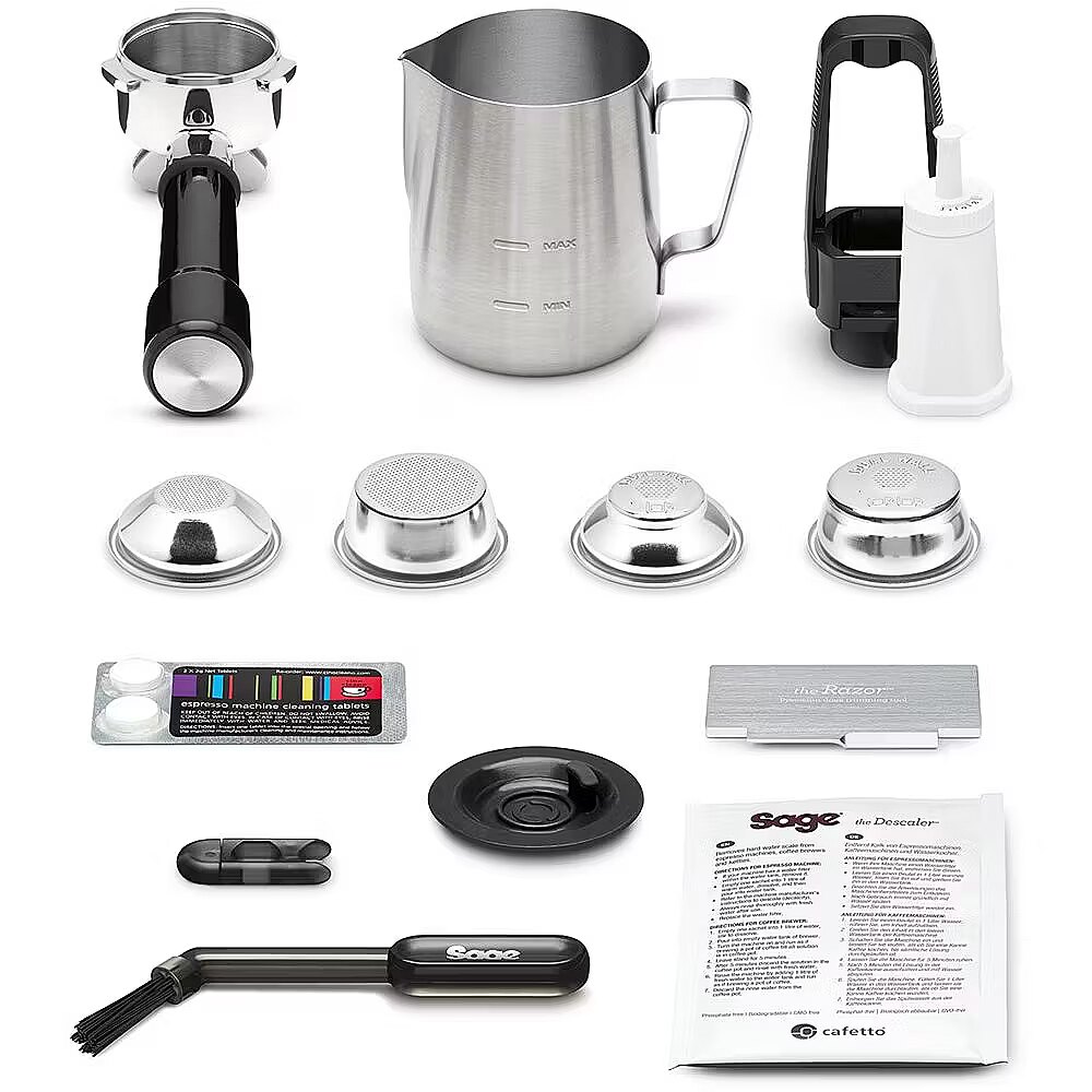 Accessories included - 54mm Stainless Steel Flask 480ml Stainless Steel Milk Jug Single and Double Bottom Strainers (1 Cup and 2 Cups) Water Filter Holder and Filter Water Hardness Test Strip Razor Coffee Leveler Cleaning Tablets Steam Nozzle Cleaning Tool Cleaning Disc Cleaning Brush Descaling Powder