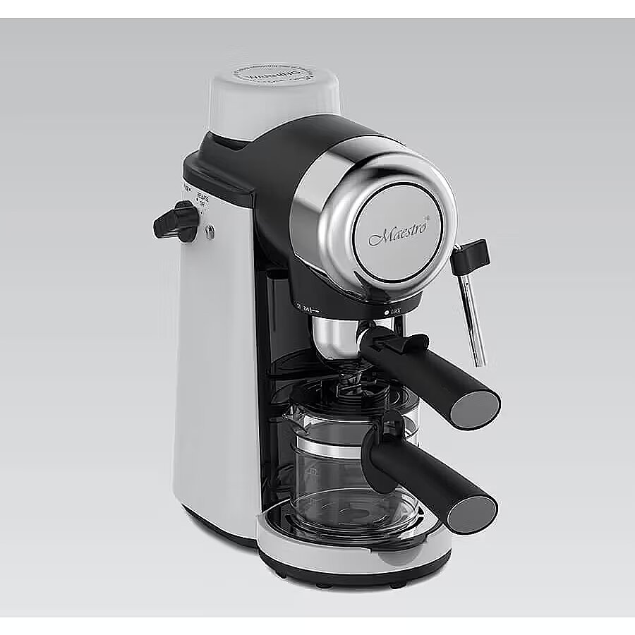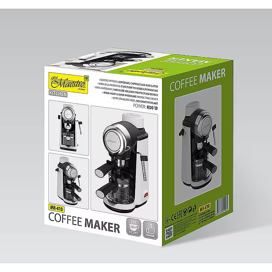 Apraksts - Maestro MR-410 kompaktais espresso kafijas automāts ar kolbu ir ideāls aromātiskās kafijas cienītājiem. Ar 800 W jaudu un 3,5 bāru sūkņa spiedienu tas garantē perfektu ekstrakciju intensīvam espresso aromātam. Pateicoties kafijas trauciņam, kas ir pietiekams, lai pagatavotu 4 tasītes kafijas (240 ml), kafijas pagatavošana ģimenei vai draugiem kļūst īpaši ērta. Kafijas automāts ir paredzēts lietošanai ar maltu kafiju, sniedzot iespēju izvēlēties iecienītākos maisījumus un dzēriena intensitāti. Piena putošanas funkcija ļauj izveidot perfektu putu, kas ir ideāli piemērota kapučīno un caffe latte pagatavošanai. Tā kompaktais izmērs nozīmē, ka tas atradīs vietu jebkurā virtuvē, apvienojot funkcionalitāti ar modernu dizainu. Kafijas filtrs ir izgatavots no augstas kvalitātes nerūsējošā tērauda, bet kolba ir izgatavota no presēta alumīnija, kas tieši ietekmē aparāta izturību. Ierīcei ir vairākas drošības funkcijas, kas novērš mašīnas pārkaršanu un pārmērīga spiediena veidošanos. Izbaudiet baudas mirkli ar perfektu kafiju, ko varat pagatavot pašu mājās.