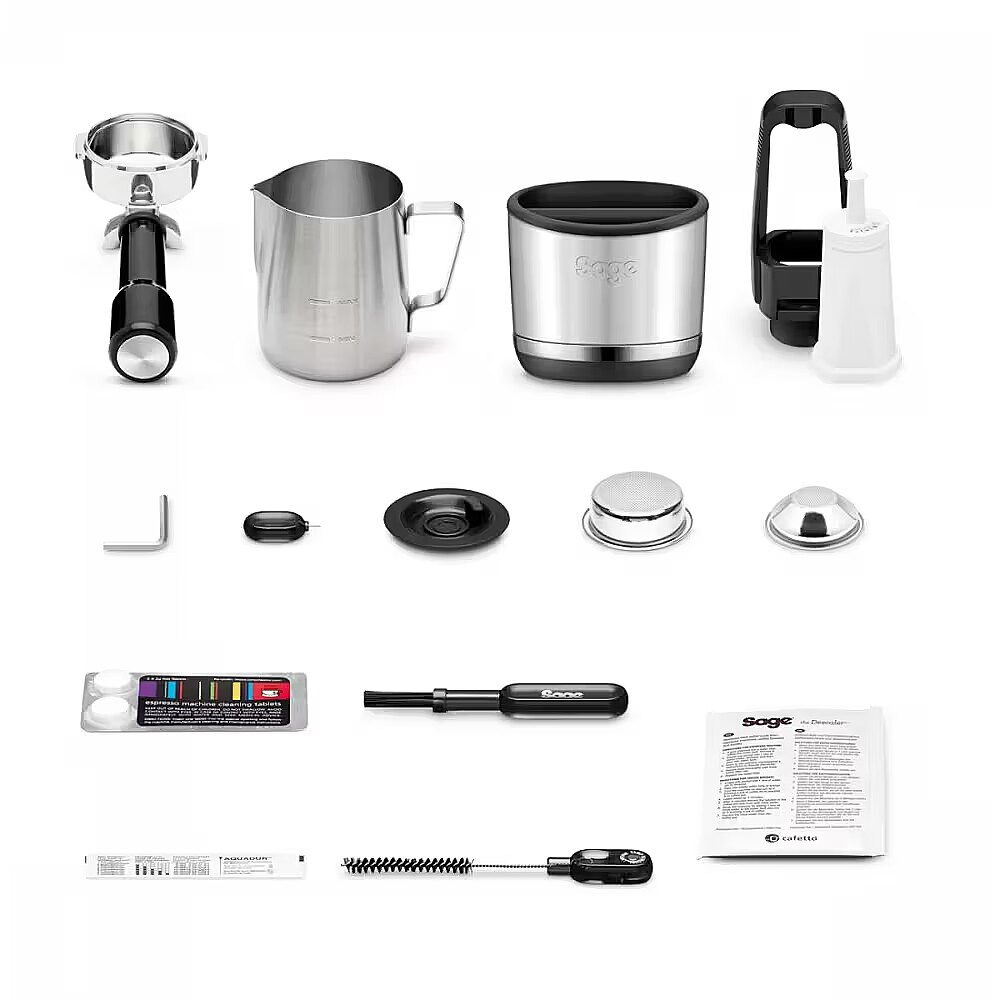 Iekļautie piederumi - Nerūsējošā tērauda kolba 58 mm Nerūsējošā tērauda piena krūze 480 ml Knock Box 10 Filtra sietiņš ar vienu dibenu 1 tasītei Filtra sietiņš ar vienu dibenu 2 tasītēm Pilienu teknes aizsargs (iekļauts tikai krāsainiem kafijas automātiem) Tīrīšanas komplekts