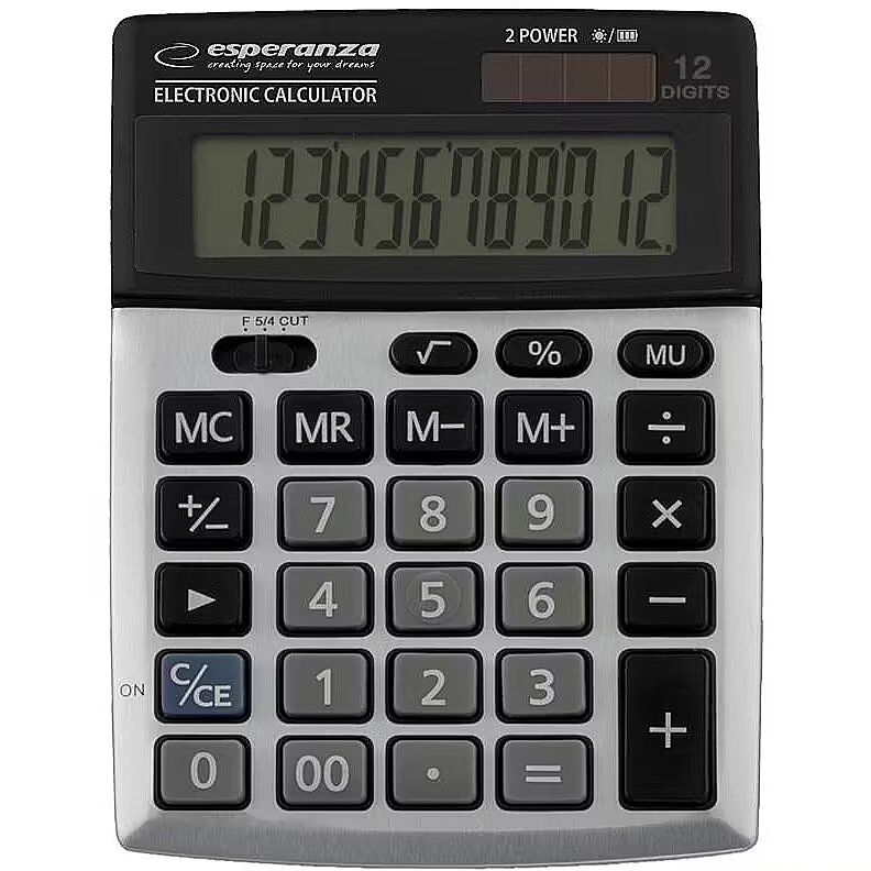 Apraksts - Elektroniskais galda kalkulators ar lielu 12 ciparu displeju. Tam ir visas matemātiskās pamatfunkcijas (saskaitīšana, atņemšana, reizināšana, dalīšana, saknes, procentu aprēķins), ievietoto skaitļu apgriešanas funkcija un iespēja saglabāt rezultātus. Noliektais displejs, lielie cipari un lielie taustiņi atvieglo darbu ar kalkulatoru. Ideāli piemērots ikdienas lietošanai veikalos un birojos.