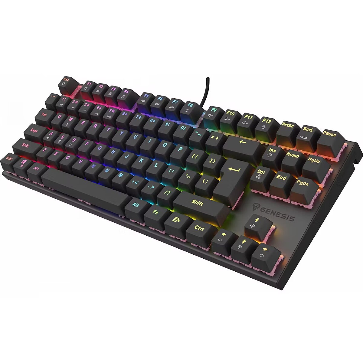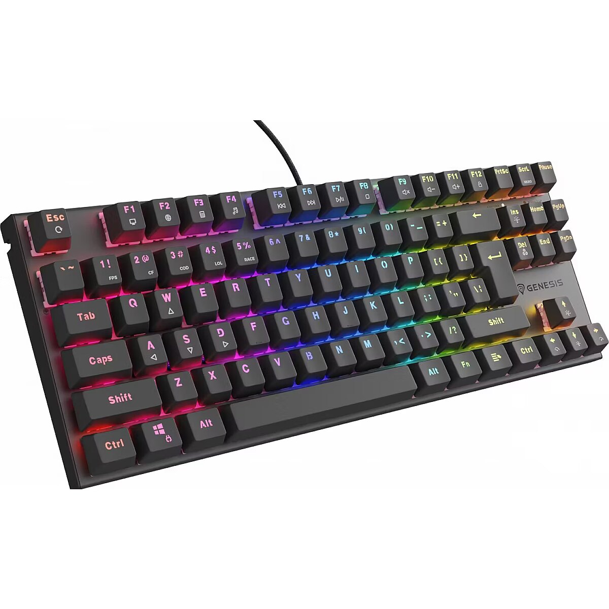 LongSummaryDescription - GENESIS Thor 303 TKL. Keyboard form factor: Tenkeyless (80 - 87%). Keyboard style: Straight. Connectivity technology: Wired, Device interface: USB, Keyboard key switch: Mechanical, Keyboard layout: QWERTY, Keyboard number of keys: 87. Backlight type: RGB LED. Cable length: 1.8 m. Recommended usage: Gaming. Product colour: Black