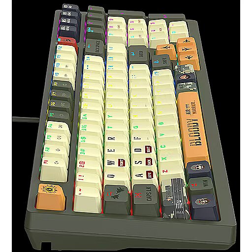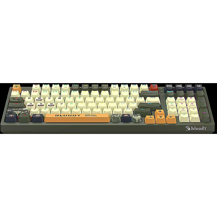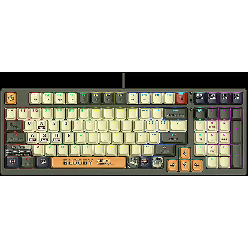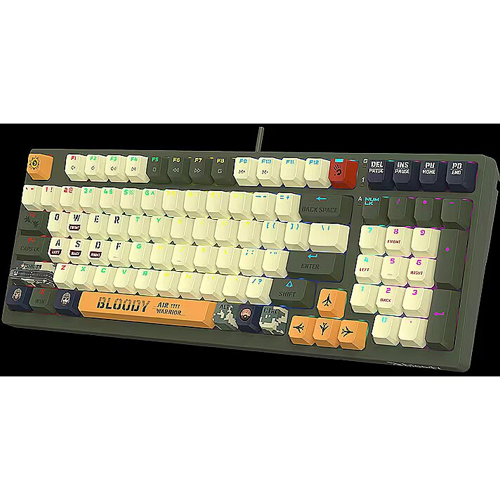 Description - S98 Aviator RGB mechanical keyboard Bloody BLMS Customize Mechanical Switch The actuation point and force have been specially tuned to provide gamers with incredible gaming speed and experience! Can be replaced during operation Compatible with 3-pin and 5-pin mechanical switches. Extremely quiet typing The silicone filling reduces echoes caused when writing. Silicone pads reduce noise resulting from internal impacts. 24 PBT gaming keycaps Most popular gaming keycaps feature PBT materials that increase their durability. Bloody's PBT keycaps are designed to be lightweight for an even better gaming experience. Keyboard with 98 keys The compact 2-zone design provides functionality equivalent to a full-size keyboard, minimizing the use of space. 3-way cable management The keyboard is equipped with a Type-C interface with 3-way routing for better cable management. Two adjustable legs The keyboard is equipped with a tilting stand with 2 levels of height adjustment, which allows you to personalize your typing experience. RGB backlit Adjust the backlight freely with 16.8 million colors, creating your own unique "self-adapting" RGB. Default 10 lighting effects Customize lighting effects by pressing FN keys with "FN+0~9" keys. Memory 7 game modes Press Fn+F9/F10 to switch 7 game modes. Built-in memory The erasable EEPROM can store 7 kinds of key configurations on different computers to provide driver-free memory function.