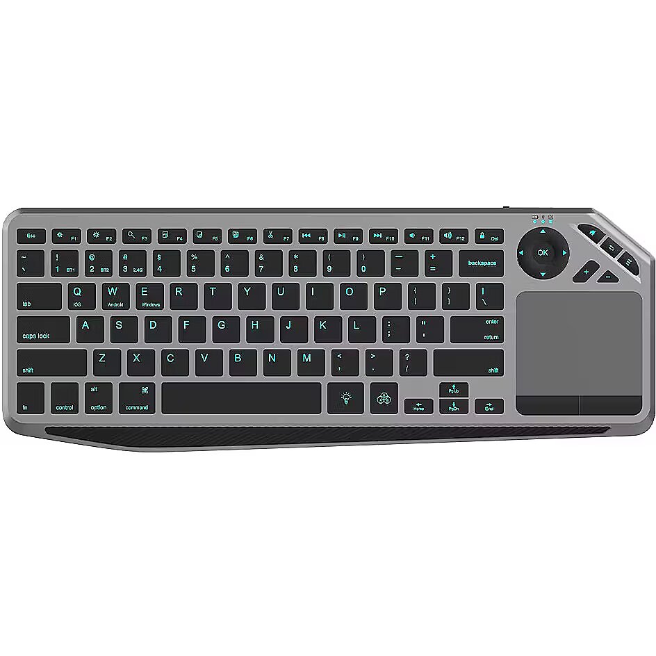 Apraksts - Praktiska un kompakta divu režīmu Bluetooth un 2,4 GHz Wi-Fi tastatūra, kas ir ideāli piemērota, lai kontrolētu datoru, kurš ir savienots ar viedo televizoru, bez sarežģījumiem ar kabeļiem un vairāku ierīču pieslēgšanas; Šķēres slēdža dizains nodrošina klusu un efektīvu rakstīšanu; To var lietot jebkurā vietā, jo to ir viegli pārnēsāt Ar septiņu krāsu apgaismojumu un trīs līmeņu intensitātes regulēšanu to ir ērti lietot pat tumsā Integrēts precīzs skārienpaliktnis kursora vadībai un virzienvadītājs navigācijai populārāko viedo televizoru tīkla izkārtojumā nodrošina ļoti ērtu un intuitīvu navigāciju. 2.4GHz tehnoloģija šai tastatūrai nodrošina spēcīgu un uzticamu savienojumu; Plug and play, nav nepieciešama draiveru instalēšana. Vienkārši pievienojiet nelielo A tipa USB uztvērēju, un tastatūra ir gatava lietošanai.