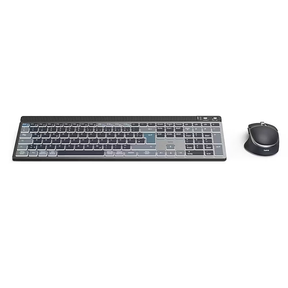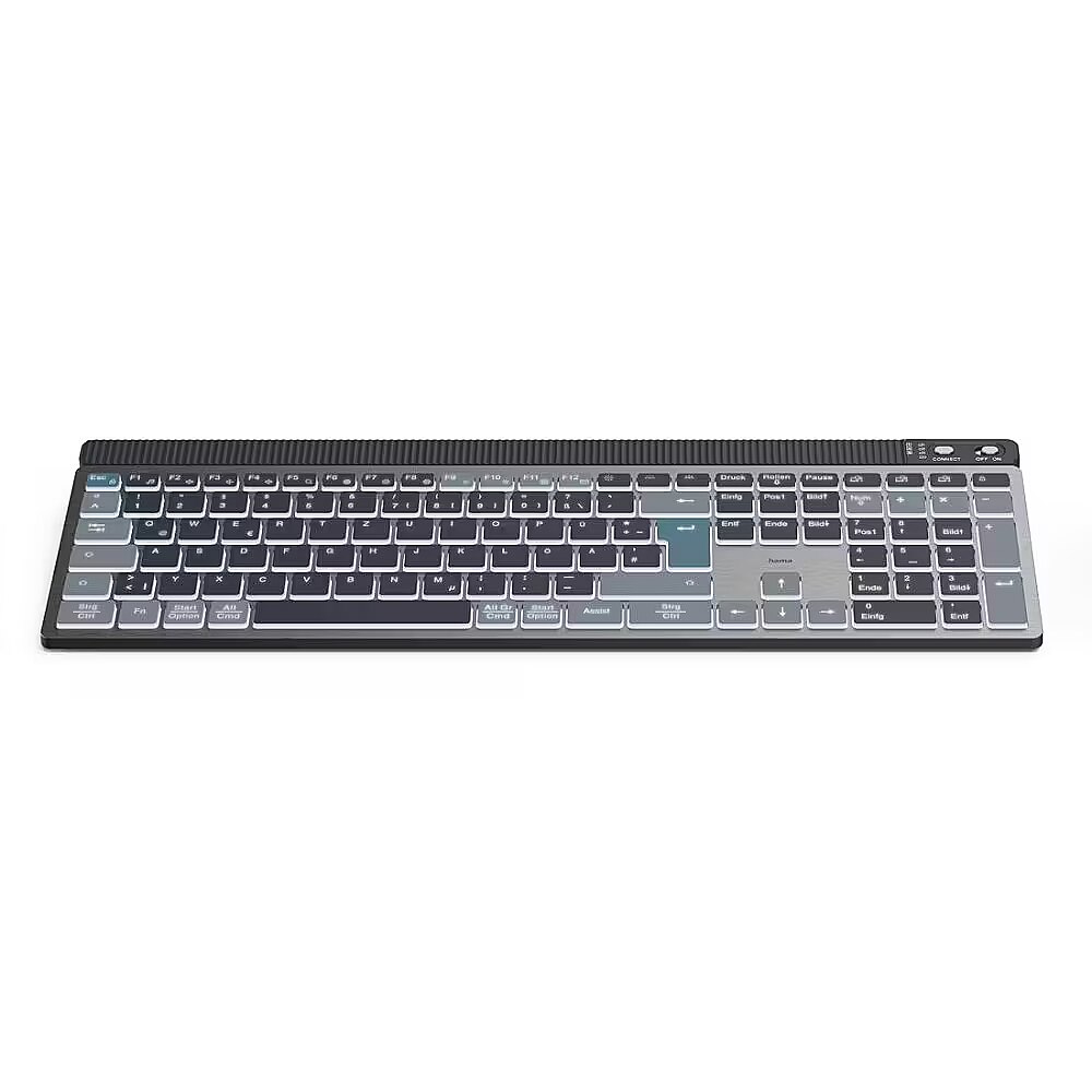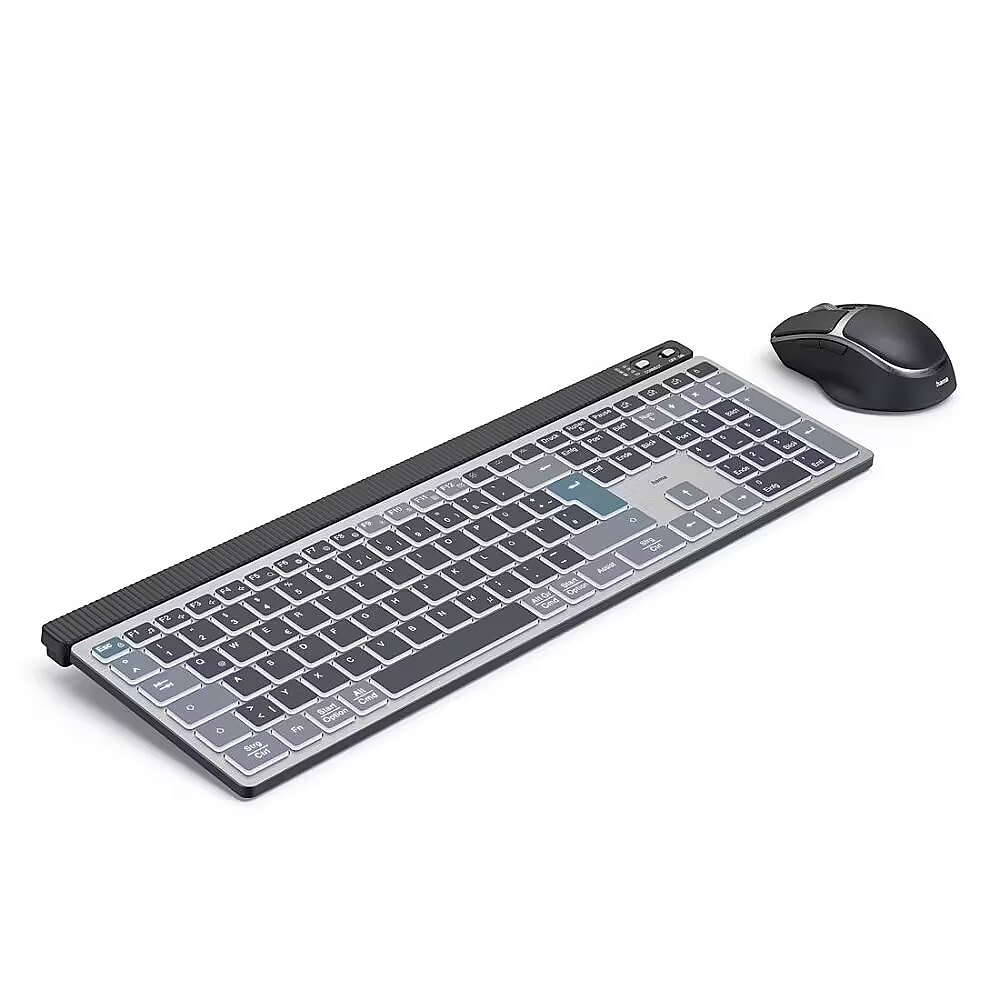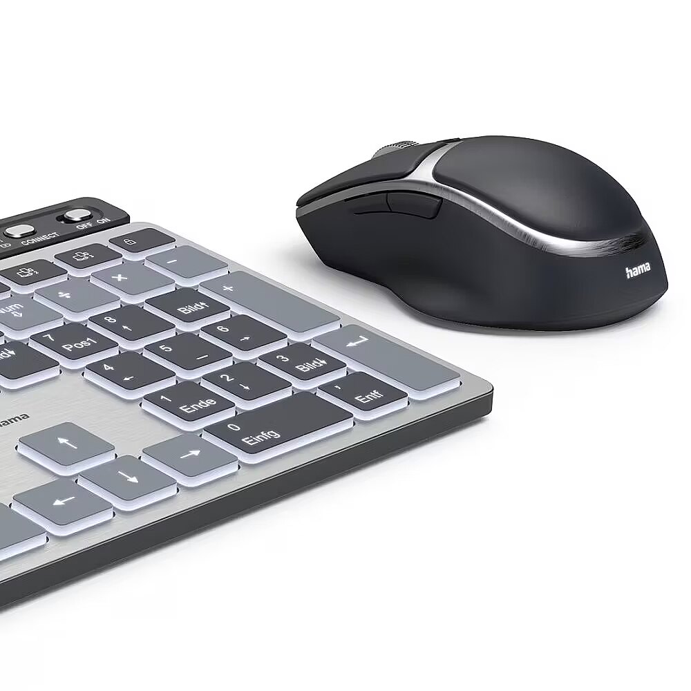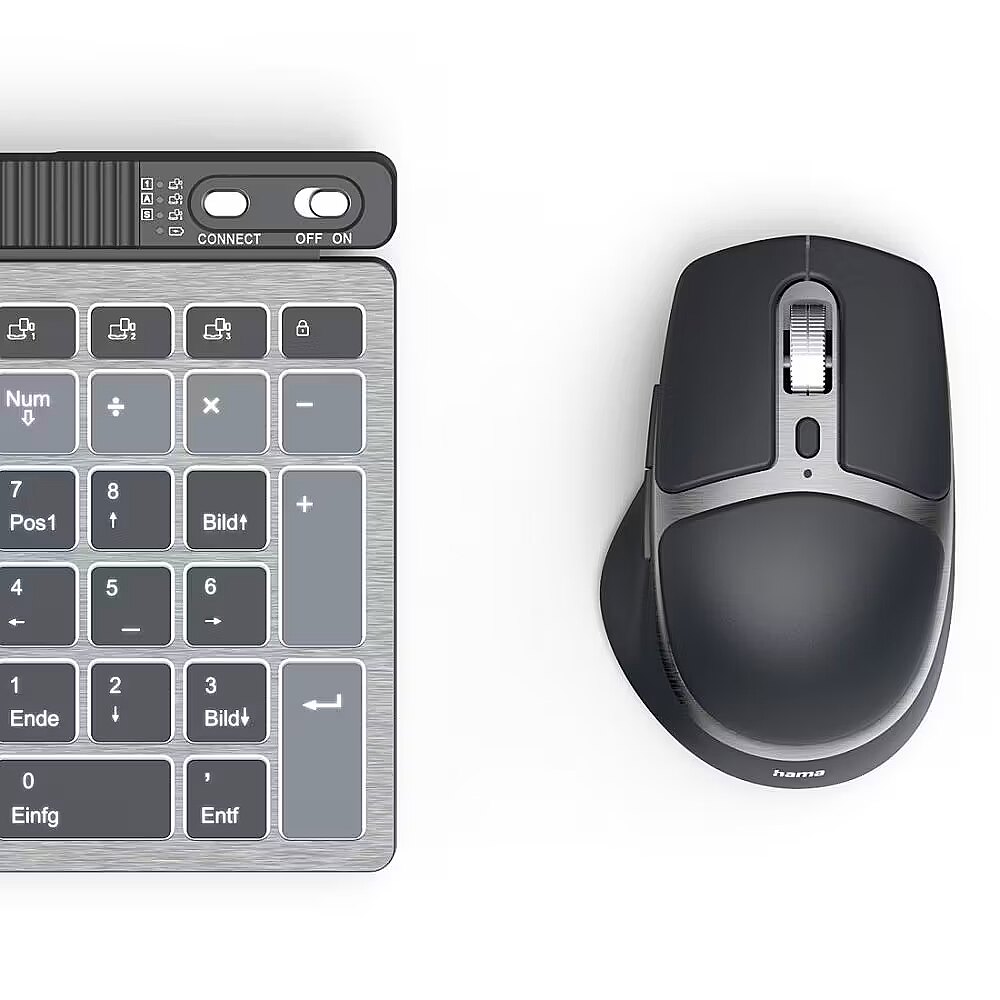Zestaw bezprzewodowy Hama WKM-750, wykonany z aluminiowych komponentów, oferuje wszechstronną łączność multi-device, umożliwiając jednoczesne podłączenie do trzech urządzeń (1 USB, 2 Bluetooth) i szybkie przełączanie między nimi za pomocą przycisku. Stabilne połączenie 2,4 GHz oraz Bluetooth 5.2 zapewnia swobodę użytkowania na odległość do 10 metrów.