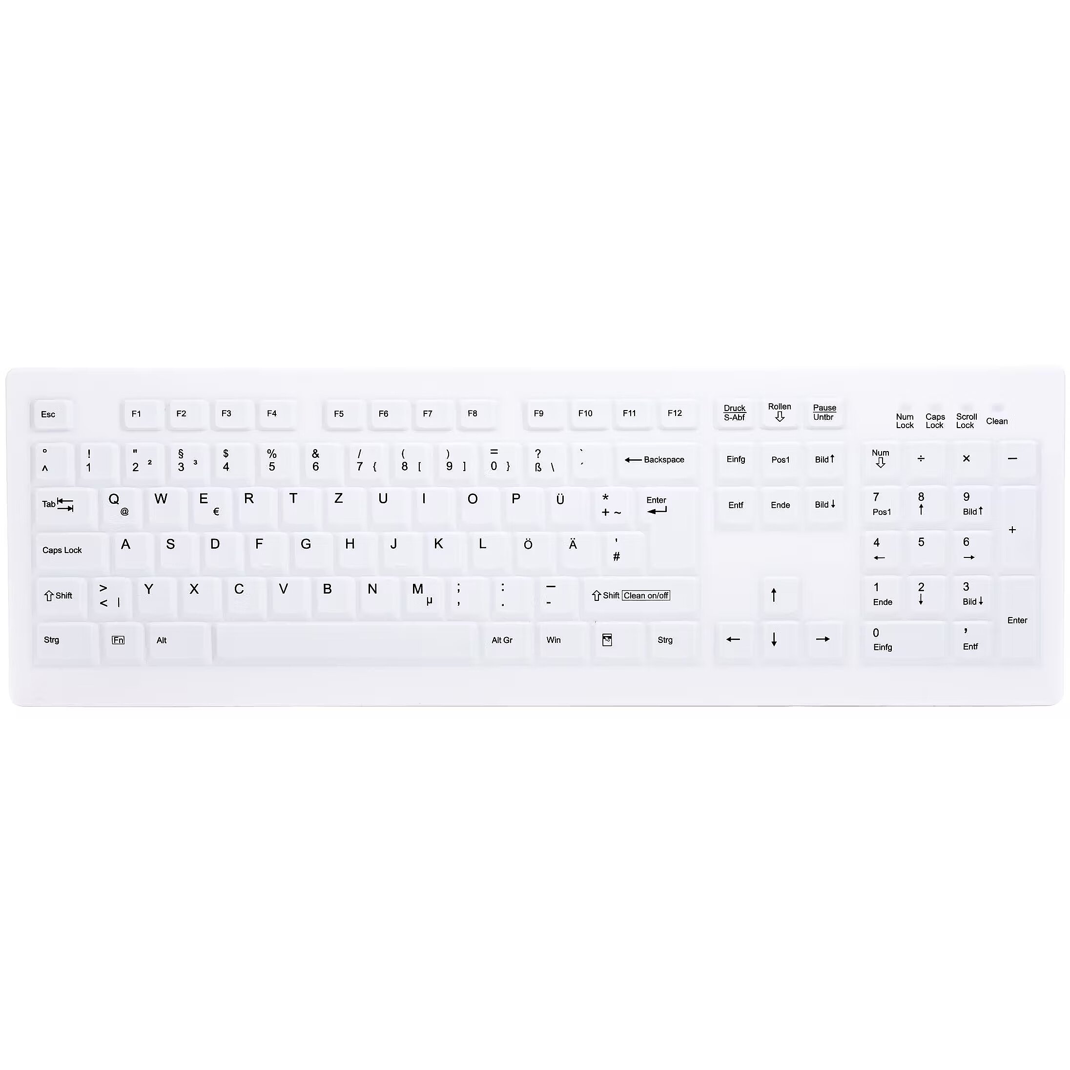 LongDesc - MEDICAL PC KEYBOARD FOR CLEANING AND HYGIENEThe AK-C8100 is a high quality, reliable PC keyboard. The purification and disinfection capacity makes it a perfect fit in hospitals and at practitioners, as well as office, administration and industrial environments. The silicon membrane protects the key field against ingress of dirt and fluids.The AK-C8100 impresses with low force key actuation and precise key guidance. With its 105 key standard keyboard layout, the AK-C8100 is highly recommendable for heavy duty type writing in hygiene critical operations.Thorough surface disinfection of the key field by spray/wipe sanitizing of the seamless, low profile silicone key membrane without corners and edges.Surface disinfection instead of invasive submersion cleaning:- No inner or outer re-contamination by polluted suds.- No risk of germ proliferation and transmission by fluids leaking or dripping off the keyboard.- No contact with contaminated openings (no touch contact).CleanFunction allows to disable the key field while cleaning (“Fn”+”Clean on/off”).Suitable for a multitude of hospital disinfectants and cleaning agents.Protection Class IP68 by full sealing of the key membrane with the keyboard housing or Exchange of silicone key membrane for routine disinfection.