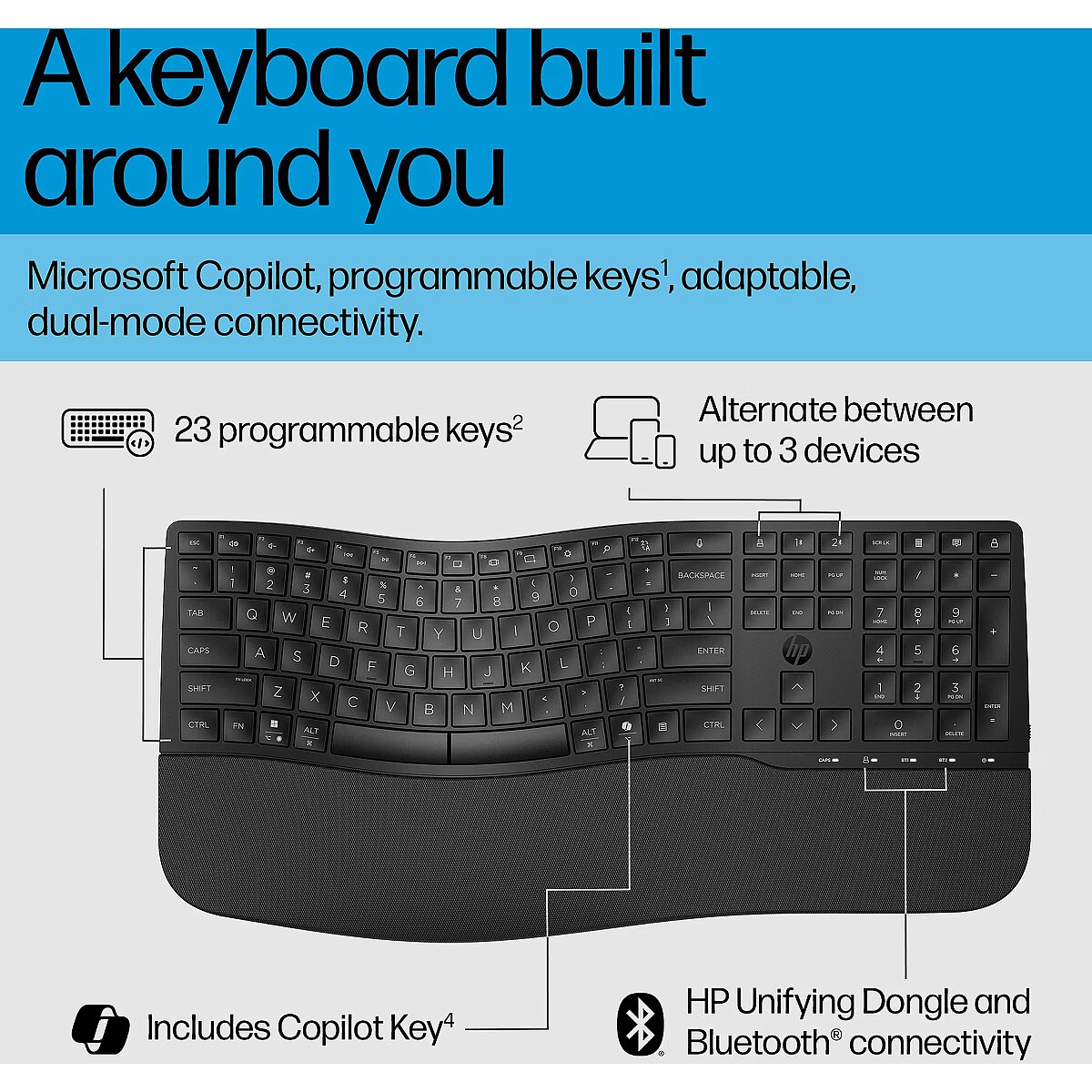 LongDesc - A keyboard built around youNeed a keyboard that fits to your style? The HP 680 Comfort Dual-Mode Keyboard is just your type. With adjustable typing angles, programmable keys[1], and secure connectivity, this keyboard boasts all the comfort, customization, and compatibility you need.
