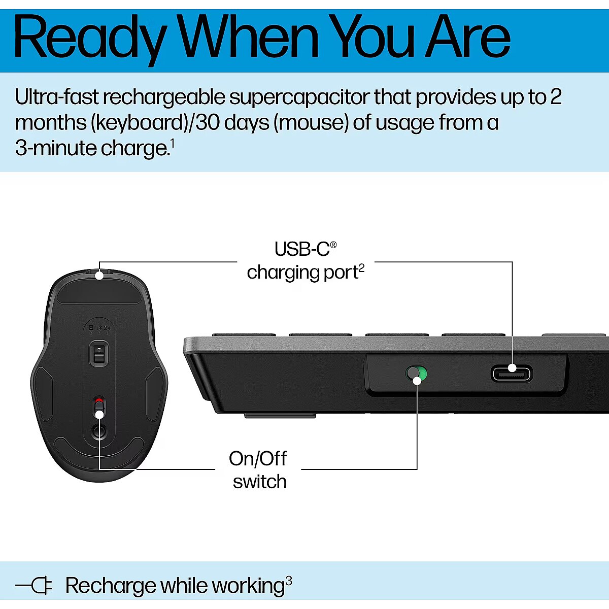 ShortSummaryDescription - HP 720 Multi-Device Rechargeable Wireless Keyboard and Mouse Combo, bezvadu, USB + Bluetooth, mehāniskā, QWERTY, melna, iekļauta pele