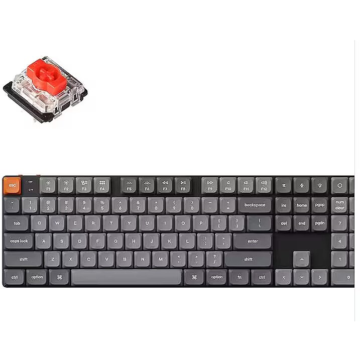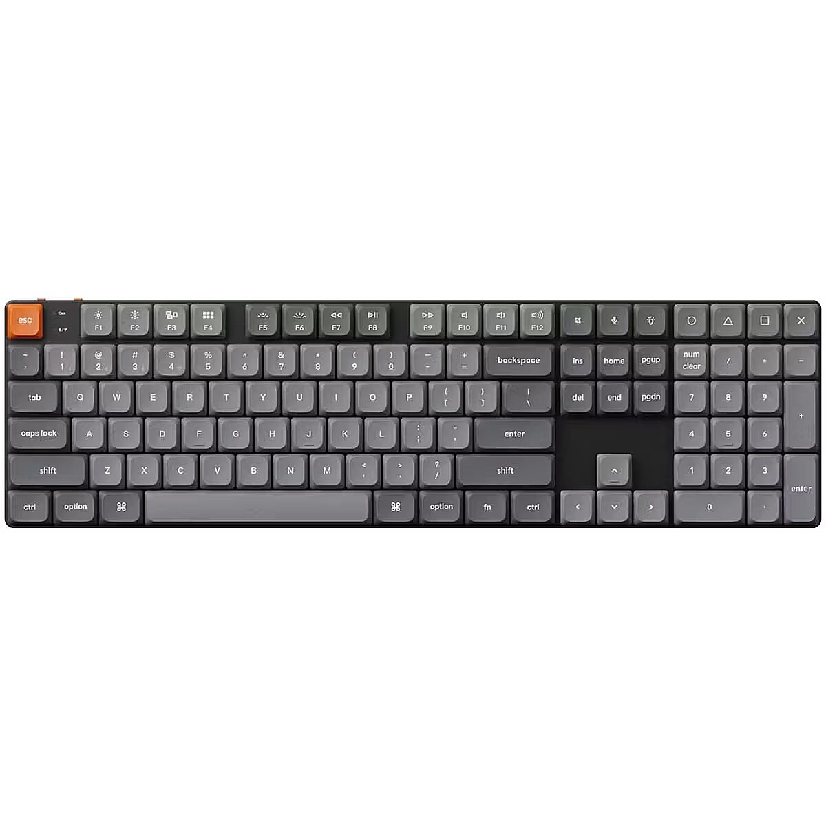 Summary - Keychron K5 Max. Keyboard form factor: Full-size (100%). Keyboard style: Straight. Connectivity technology: Wired & Wireless, Device interface: USB + RF Wireless + Bluetooth, Keyboard key switch: Mechanical, Keyboard number of keys: 104. Backlight type: LED. Recommended usage: Universal. Product colour: Black, Grey