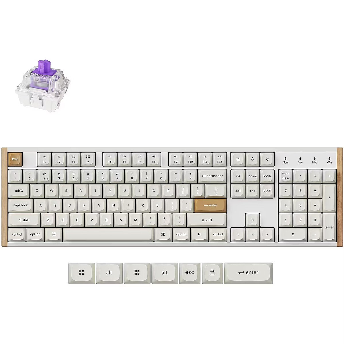 Summary - Keychron K10 HE. Keyboard form factor: Full-size (100%), Connectivity technology: Wired & Wireless, Device interface: USB + RF Wireless + Bluetooth, Keyboard key switch: Magnetic-mechanical key switch, Keyboard layout: QWERTY. Backlight type: RGB LED. Recommended usage: Gaming. Product colour: White, Wood
