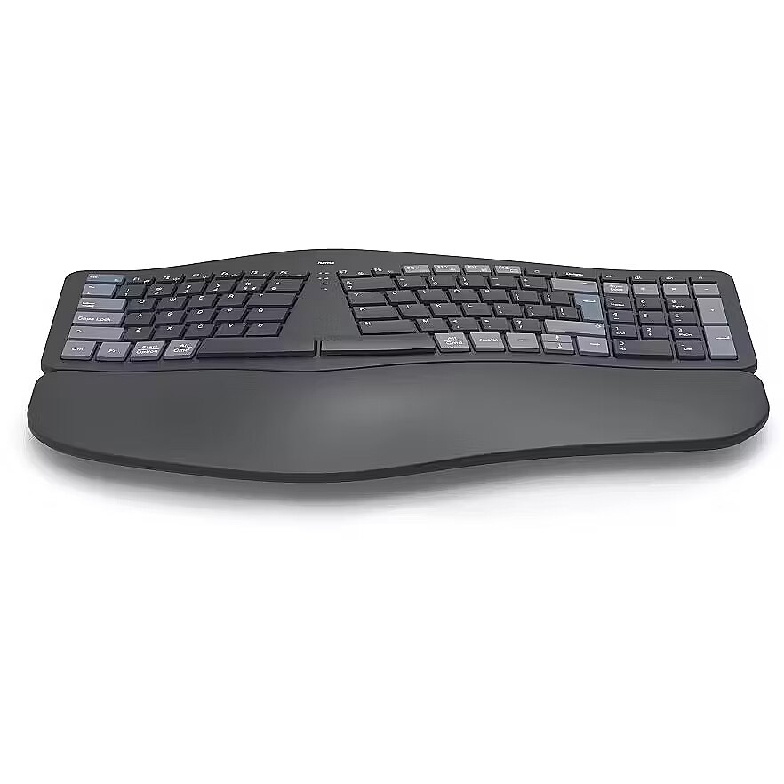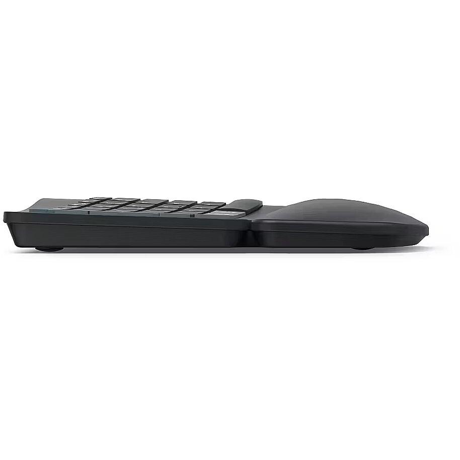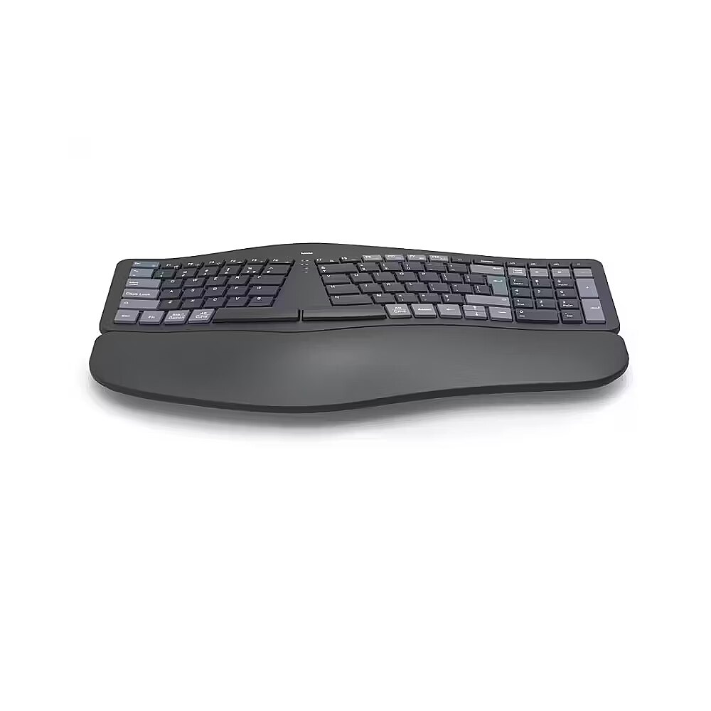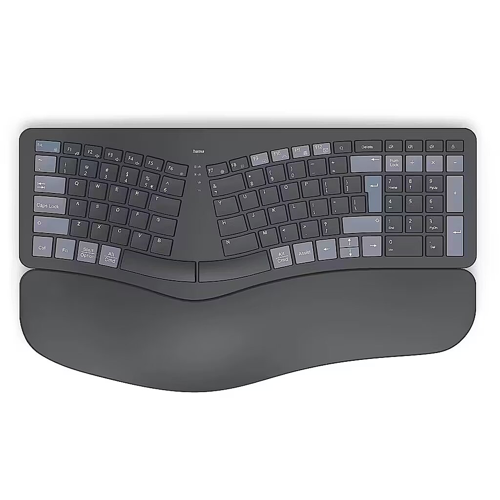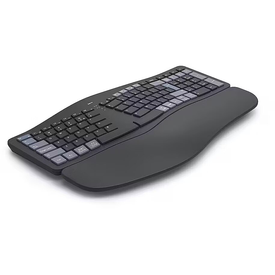 Description - Supports Natural Posture: Ergonomic design promotes a natural body position, reducing strain and discomfort in shoulders, arms, and neck. Multi-Device Ready: Equipped with 1 radio channel and 2 Bluetooth channels, it can connect to up to 3 devices simultaneously, with seamless switching at the touch of a button. Soft Wrist Support: Integrated wrist rest is optimally padded for ergonomic typing comfort, reducing strain on hands and wrists. Adjustable Typing Angle: Foldable keyboard feet allow adjustment of the typing angle for secure and comfortable work. Negative Tilt Design: Hands remain relaxed thanks to the keyboards negative typing angle, minimizing fatigue during extended use. Split-Key Layout: Ergonomically split panel matches the natural shape of the hand, keeping muscles and tendons relaxed. Durable Scissor-Switch Keys: Long-lasting, quiet, and responsive keys provide smooth, intuitive typingeven at high speeds. AI-Enhanced Productivity: Dedicated Assist key activates a multi-application AI assistant for improved workflow. Fn Key Combinations: Control multimedia functions via secondary key assignments without cumbersome system adjustments. Easy FN-Lock: Swap the primary and secondary F1F12 key functions to use multimedia shortcuts without holding Fn. Adjustable Backlighting: Customizable keyboard illumination ensures comfortable use in low-light conditions. Long-Lasting Battery: Built-in lithium-polymer battery supports versatile wireless usage. Eco-Friendly Materials: At least 20% of the keyboard is made from recycled materials, supporting a circular economy. Secure Typing: All keystrokes are AES-128 encrypted for enhanced data security. Compact Storage: USB receiver can be stored inside the keyboard, saving desk space.