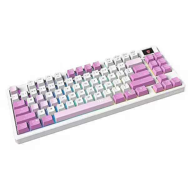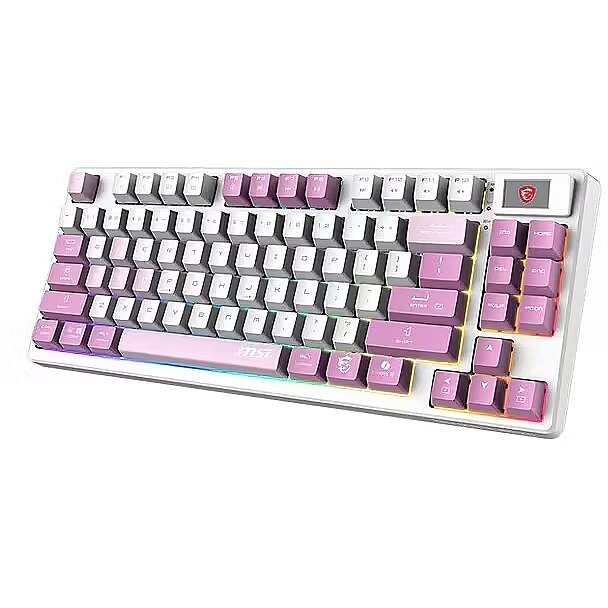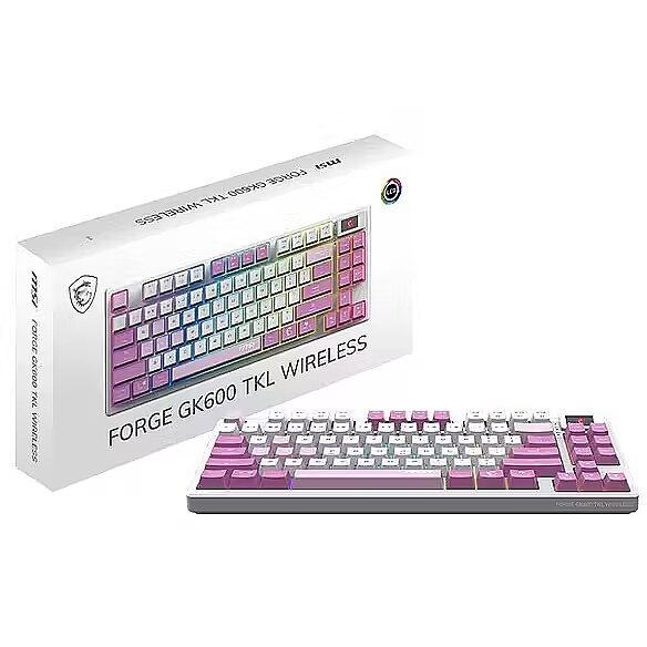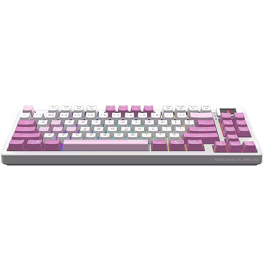 LongDesc - The MSI FORGE GK600 TKL WIRELESS VIOLET is a versatile tenkeyless keyboard with 2.4GHz wireless, Bluetooth, and wired modes. It features hot-swappable linear mechanical switches, durable PBT keycaps, sound-dampening gaskets, and a 1.06-inch display. With RGB lighting and a 4000mAh battery, it's ideal for gamers and creators.ESSENTIAL KEYS, SENSATIONAL TYPINGThis keyboard features a tenkeyless design that saves desk space and boosts portability without sacrificing performance. Its linear mechanical switches offer smooth, responsive keystrokes, perfect for fast-paced gaming or precise typing. Compact yet powerful, it’s designed for those who value efficiency and style.TAILOR YOUR SWITCH ANYTIMEExplore the versatility of this keyboard, which enables you to effortlessly hot-swap default mechanical switches with third-party switches (5-pin) without any soldering. This empowers you to easily customize your typing experience, offering flexibility and long-term durability for your keyboard setup.RESILIENT AESTHETICSEquipped with dye-sublimated PBT keycaps, known for their exceptional durability and premium feel. These keycaps resist wear and fading, ensuring legends stay sharp and vibrant even after prolonged use. The textured surface provides a comfortable, reliable typing experience that lasts.INTUITIVE CONTROL & DISPLAYA 1.06-inch display shows essential information like battery status, RGB backlighting profiles, and brightness levels, keeping you informed at a glance.VERSATILE CONNECTIVITYOffering flexible connectivity with 2.4GHz wireless via the included USB dongle, Bluetooth, and wired mode through a USB Type-C connection, ensures seamless performance across all your devices.ENDURANCEA powerful 4000mAh rechargeable battery delivers up to 20 days of use with backlighting turned off. This extended battery life reduces the need for frequent recharges, providing greater convenience for long gaming or work sessions. When it's time to recharge, the battery fully powers up in just 6 hours via USB Gen 3 while the user can continue gaming.INSTANT INTERACTIONTake control with convenient hotkeys that let you quickly adjust lighting effects, manage media controls, and access widgets, enhancing your overall interaction with smooth functionality and rapid adjustments.ROLLOVER PRECISIONExperience seamless precision with N-key rollover, ensuring every keystroke is accurately registered for smooth and responsive performance in any scenario.PREFERRED ANGLESThe keyboard features two adjustable feet offering two tilt angles, allowing for a more ergonomic wrist position during extended use.CREATE YOUR VIBEWith 20 predefined lighting effects and 5 adjustable levels of speed and brightness, the RGB backlighting offers a personalized aesthetic that enhances both function and style. Easily creating a dynamic atmosphere for gaming or setting a more subdued tone for work, the customizable options provide flexibility to match any preference or environment.