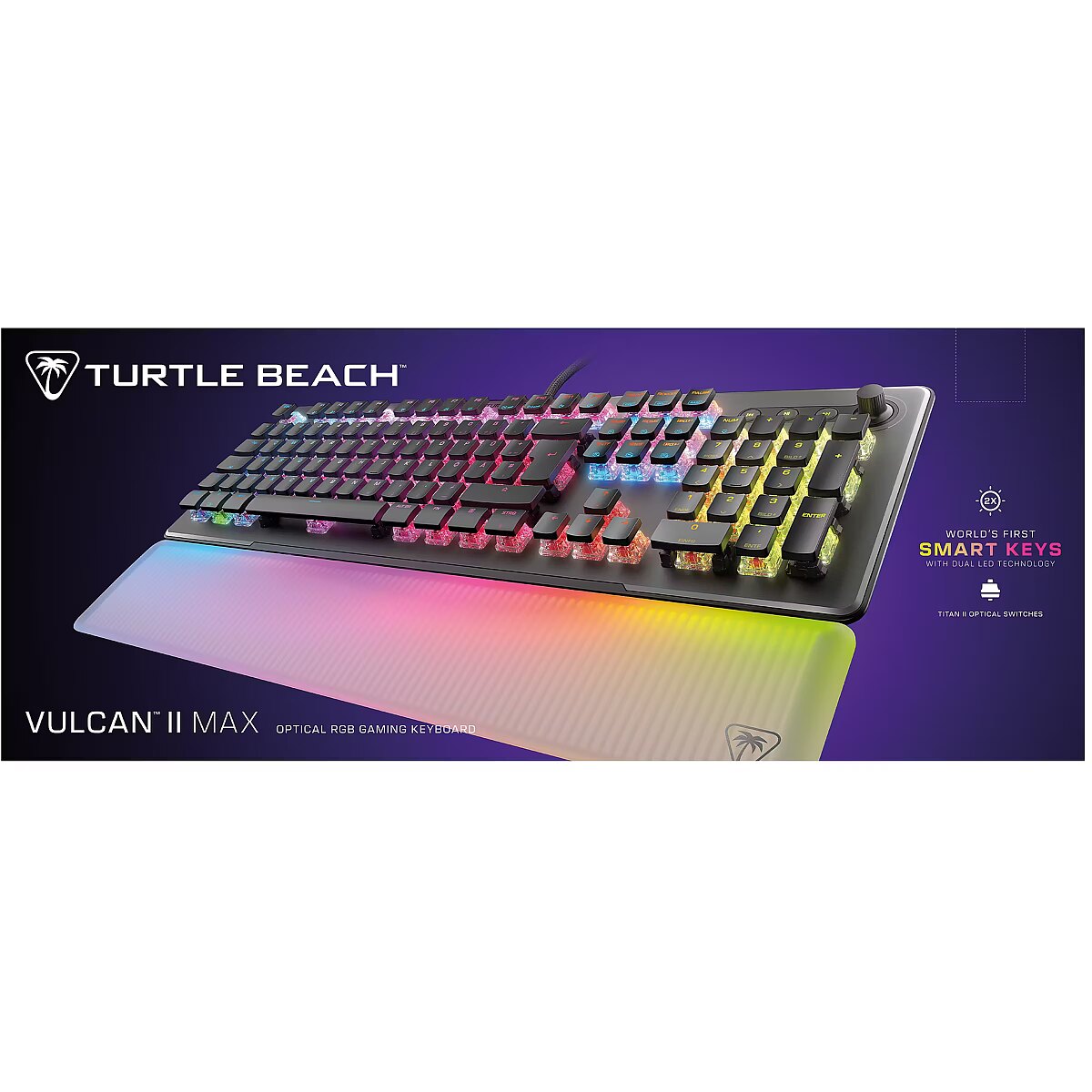 LongSummaryDescription - Turtle Beach Vulcan II Max. Keyboard form factor: Full-size (100%). Keyboard style: Straight. Connectivity technology: Wired, Device interface: USB, Keyboard key switch: Opto-mechanical key switch, Keyboard layout: QWERTZ. Backlight type: RGB LED, Wrist rest. Cable length: 1.8 m. Recommended usage: Gaming. Product colour: Black