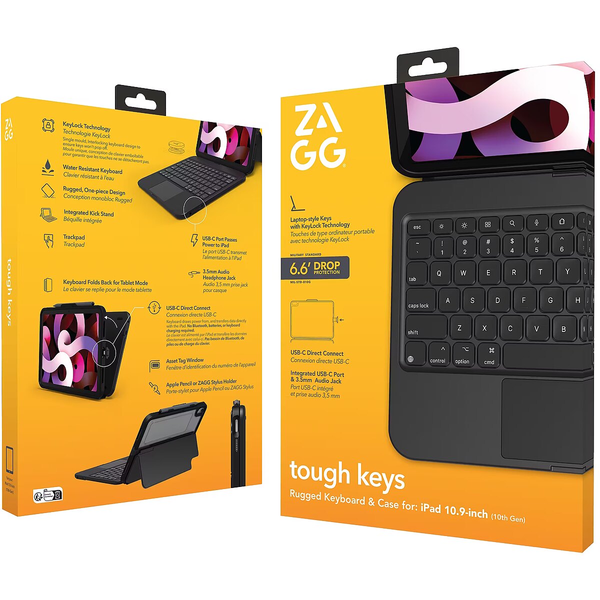 LongSummaryDescription - ZAGG Tough Keys-Apple-iPad 10th Gen/A16-Black-German(B2B Brown Box). Keyboard layout: QWERTZ, Keyboard language: German, Pointing device: Touchpad. Brand compatibility: Apple, Compatibility: iPad 10th Gen, Product colour: Black. Connectivity technology: Wired, Device interface: USB Type-C. Power source: USB. Package type: Box