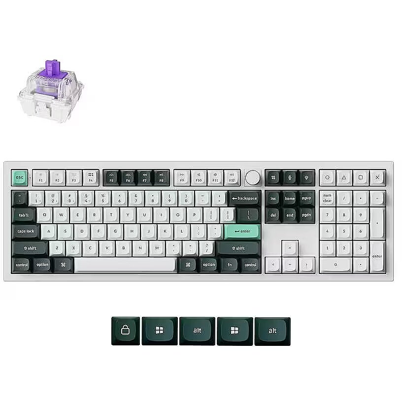 Summary - Keychron Q6 HE. Keyboard form factor: Full-size (100%). Keyboard style: Straight. Connectivity technology: Wired & Wireless, Device interface: USB + RF Wireless + Bluetooth, Keyboard key switch: Magnetic-mechanical key switch, Keyboard layout: QWERTY, Keyboard number of keys: 108. Backlight type: RGB LED. Cable length: 1.8 m. Recommended usage: Gaming. Product colour: Dark Green, White