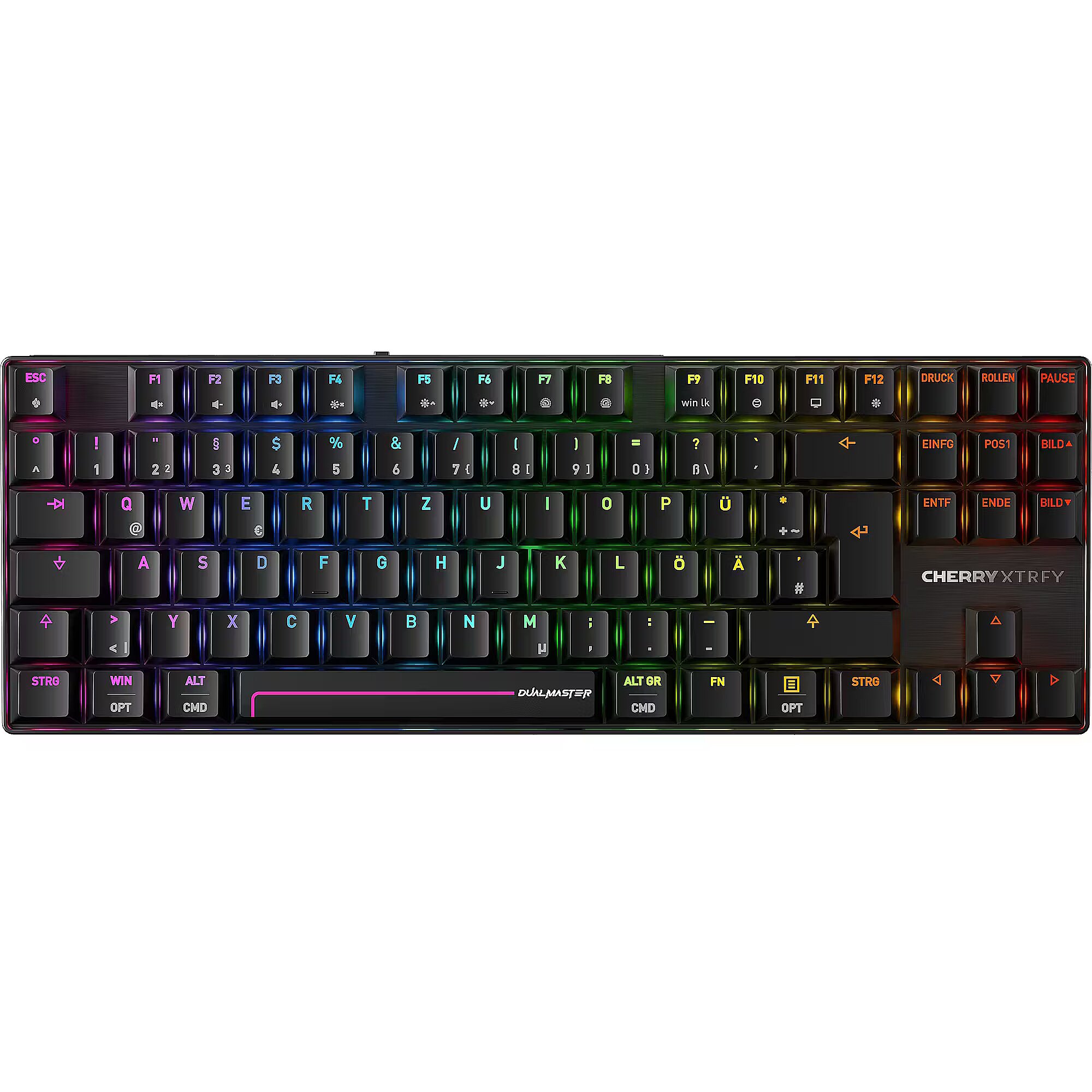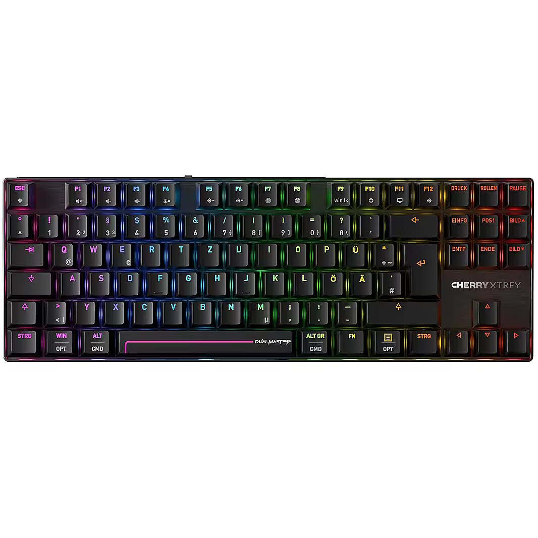 LongSummaryDescription - CHERRY MX 8.2 Pro TMR Wireless. Keyboard form factor: Tenkeyless (80 - 87%). Keyboard style: Straight. Connectivity technology: Wired & Wireless, Device interface: USB + RF Wireless + Bluetooth, Keyboard key switch: Magnetic-mechanical key switch, Keyboard layout: QWERTZ, Keyboard number of keys: 88. Backlight type: RGB LED. Cable length: 1.8 m. Recommended usage: Gaming. Product colour: Black