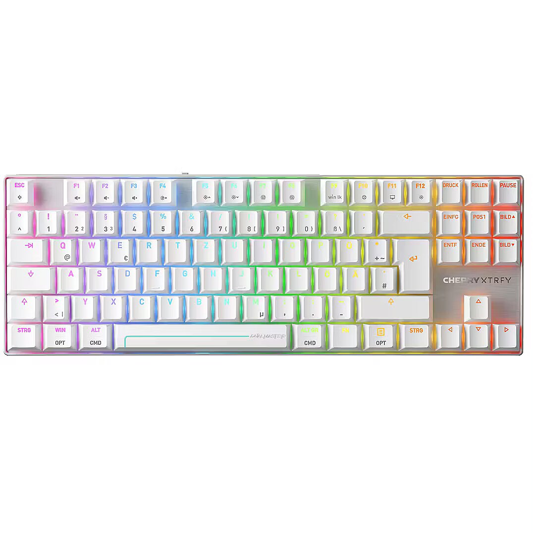LongSummaryDescription - CHERRY MX 8.2 Pro TMR Wireless. Keyboard form factor: Tenkeyless (80 - 87%). Keyboard style: Straight. Connectivity technology: Wired & Wireless, Device interface: USB + RF Wireless + Bluetooth, Keyboard key switch: Magnetic-mechanical key switch, Keyboard layout: QWERTZ, Keyboard number of keys: 88. Backlight type: RGB LED. Cable length: 1.8 m. Recommended usage: Gaming. Product colour: Silver, White