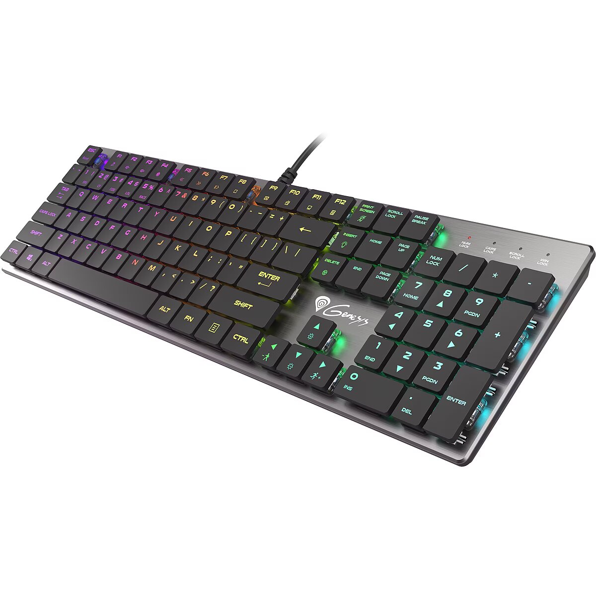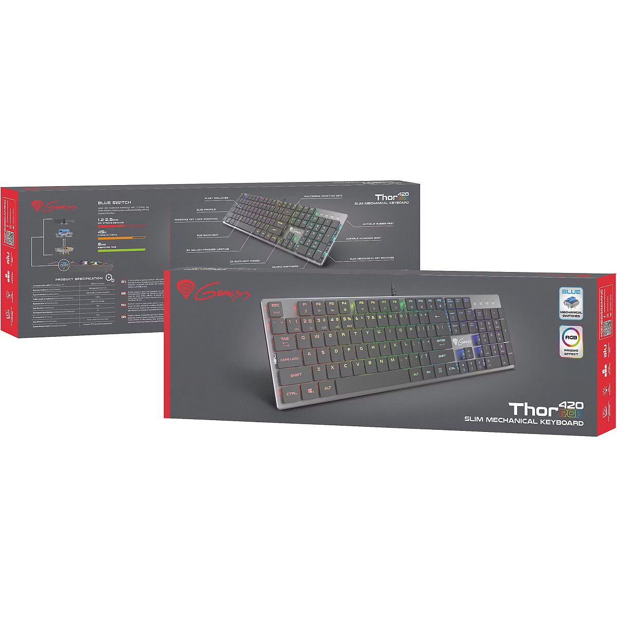 LongSummaryDescription - GENESIS Thor 420 RGB. Keyboard form factor: Full-size (100%). Keyboard style: Straight. Connectivity technology: Wired, Device interface: USB, Keyboard key switch: Mechanical, Keyboard layout: QWERTY, Keyboard number of keys: 104. Backlight type: RGB LED. Cable length: 1.65 m. Recommended usage: Gaming. Product colour: Silver