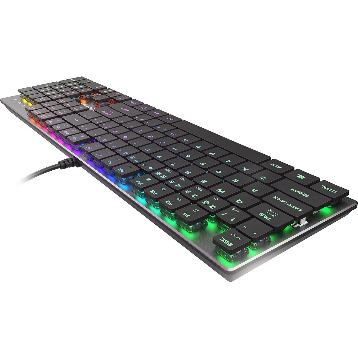 LongSummaryDescription - GENESIS Thor 420 RGB. Tastatūras formas faktors: Pilna izmēra (100%). Tastatūras stils: Taisna. Savienojamības tehnoloģija: Ierīces interfeiss: Tastatūras taustiņu slēdzis: Tastatūras izkārtojums: mehāniskā, Klaviatūras izkārtojums: Tastatūras taustiņu skaits: QWERTY, Tastatūras taustiņu skaits: 104. Fona apgaismojuma tips: APGAISMOJUMA VEIDS: RGB LED. Kabeļa garums: 1,65 m. Ieteicamais lietojums: Ieteicams: spēlēšanai. Produkta krāsa: sudraba