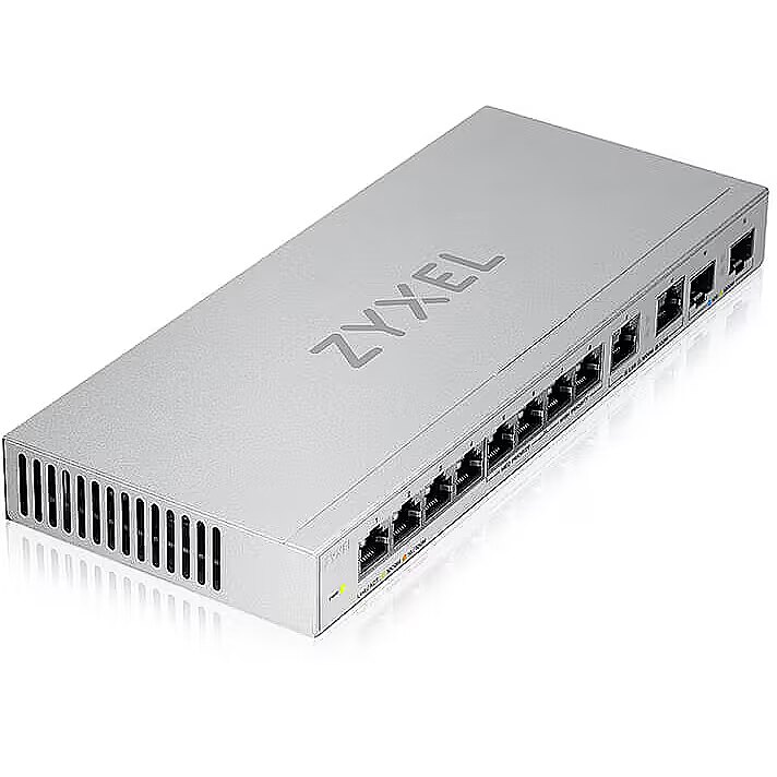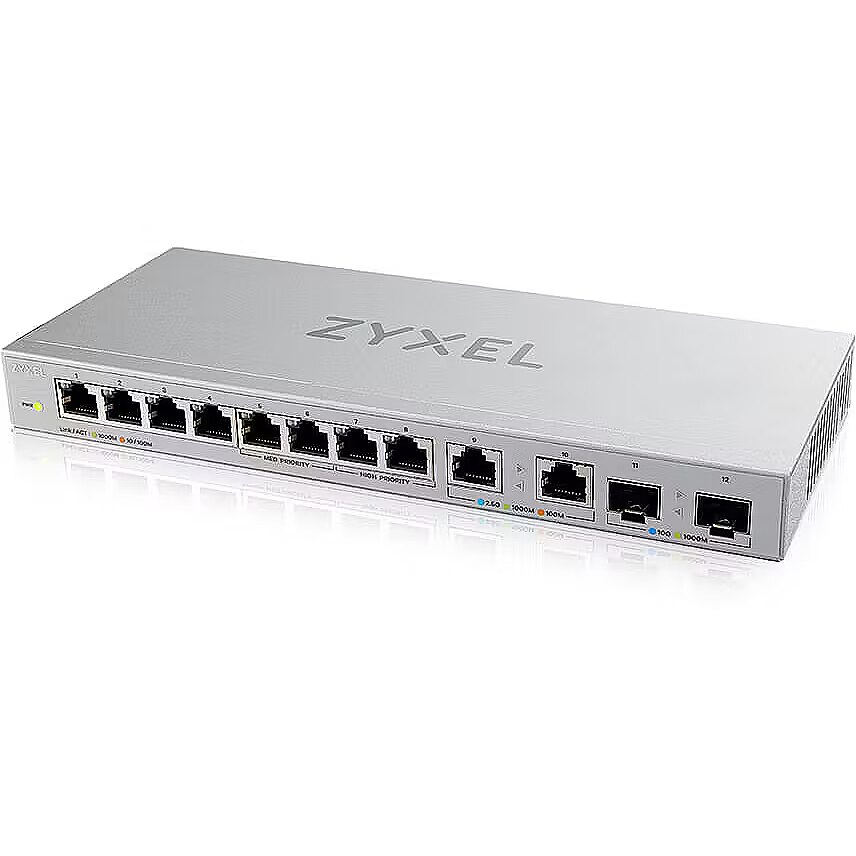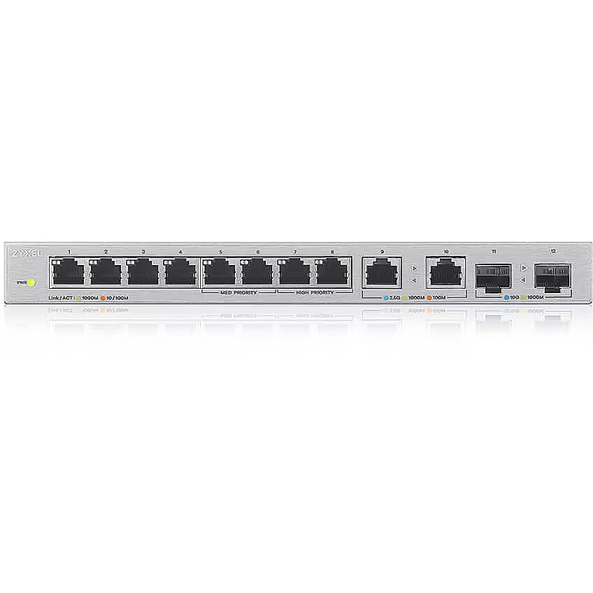 LongDesc - 12-Port 10G SFP+ Unmanaged Multi-Gigabit Switch provides high performance and simplified controlsThe Zyxel XGS1010-12 comes with two 10G SFP+ uplink ports, two 2.5G Multi-Gigabit ports, and eight Gigabit Ethernet ports with plug-and play design. It has been designed specifically for customers who require an affordable 10GbE network connectivity over a variety of mixed environments from the home to the office.Maximums the flexibility for your network.The XGS1010-12 features with 1G ports, 2.5G Multi-Gigabit ports, as well as 10G fiber ports. This port combination is capable of servicing a range of network devices such as gaming pc, NAS, workstation, or WiFi 6 AP.Experience hyper-fast 2.5G networking!Equipped with two 2.5G Multi-Gigabit ports, the switch gives your wired connection a boost, with speeds that are 2.5 times faster than standard Gigabit connections. It is the most ideal option to work with new motherboard for speedy file transfers, lag-free gaming, and high-res video streaming.10G SFP+ Ultra Speed Uplink.Provide two SFP+ ports compatible with 10GbE, which offers higher transmission speeds, instantly upgrade to a hybrid high-speed network environment at a cost-effective price.QoS for Better Traffic Control.The Zyxel XGS1010-12 comes with two high-priority and two medium p-priority ports, which provides enhanced download quality, all while giving you a better surfing, gaming, and streaming experience on other devices.Easy to Use, No Setup Required.Its easy plug-and-play design allows you to connect the XGS1010-12 to VoIP, media players, game consoles, set-top box, and any other web browsing devices to your home or studio network without any configuration.Saving energy and space.The fanless design ensures noiseless operation. Also, its built-in Energy Efficient Ethernet function automatically adjusts power consumption to dynamically reduce power usage during low link utilization. The wall-mount installation design provides more flexibility for wired home or office networks.