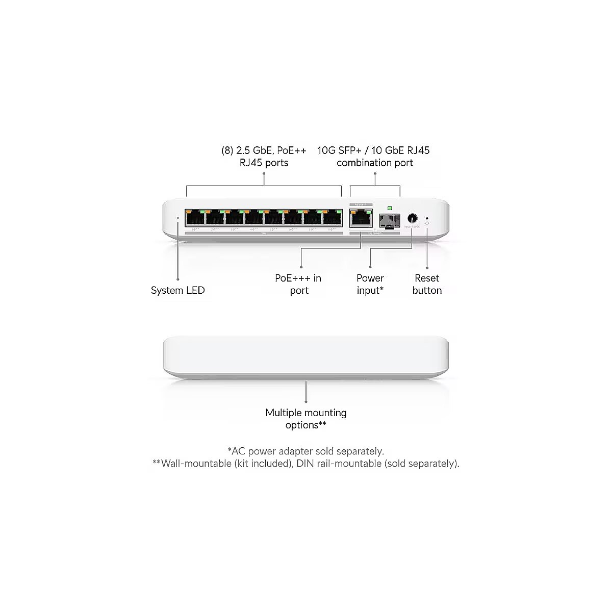 Short description - Ubiquiti Switch UniFi 8xRJ45 2.5GBit PoE++/10G RJ45/SFP+ (ohne Netzteil) Powered by PoE+/PoE++/PoE+++ or PSU, Fanless