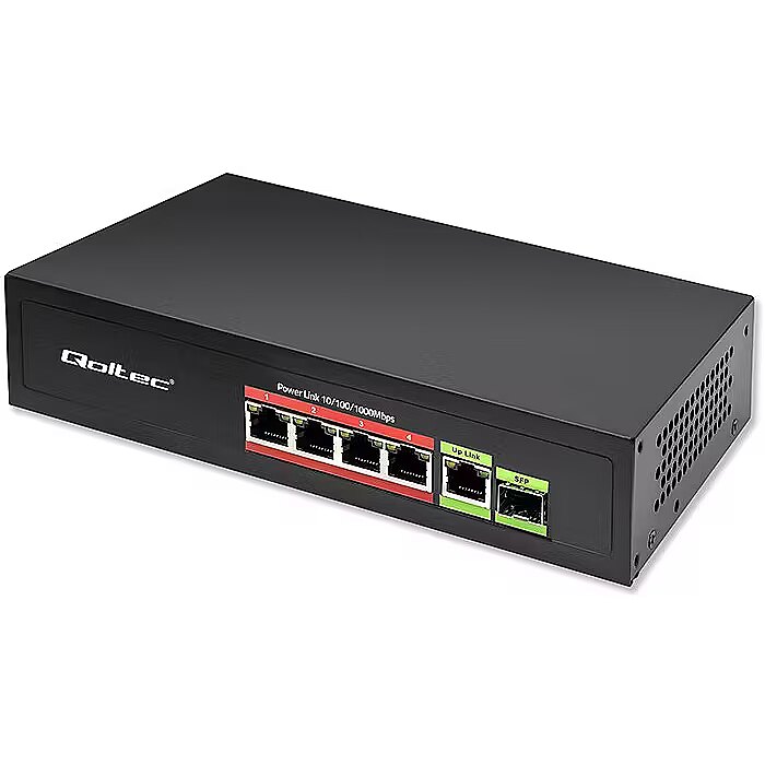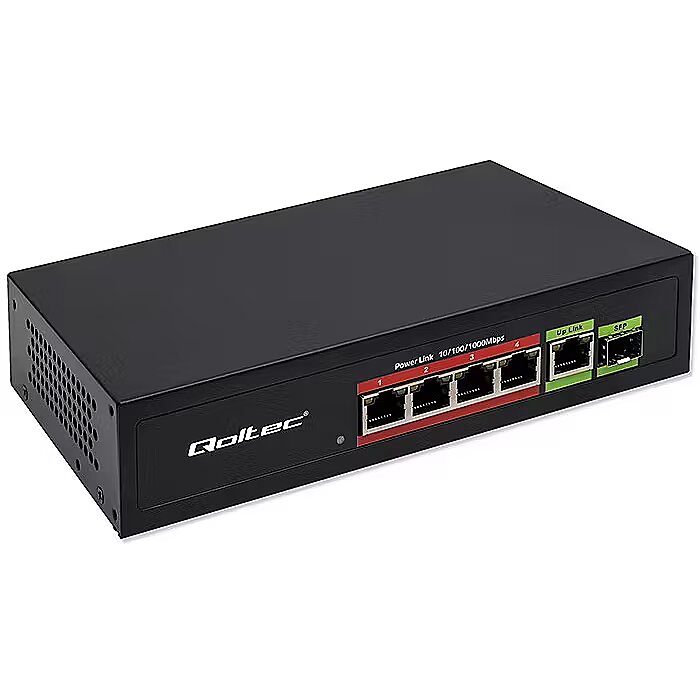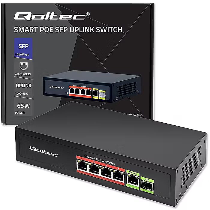 Barojiet un pārsūtiet datus ar ātrumu līdz 1 Gb/s Atklājiet jaunas iespējas ar Qoltec ierīci, kas piedāvā: Atbilstību IEEE 802.3af - līdz 15,4 W uz katru portu un līdz 65 W kopējo izejas jaudu visam komutatoram, Automātisku PoE ierīču noteikšanu, SFP portu optisko šķiedru savienojumiem, Datu pārraides ātrumu līdz 1 Gb/s, Izturīgu metāla korpusu, kas aizsargā iekšpusē esošo elektroniku un ļauj darboties sarežģītos apstākļos, Klusu darbību, pateicoties pasīvajai dzesēšanai, Plug & Play - nav nepieciešams konfigurēt.