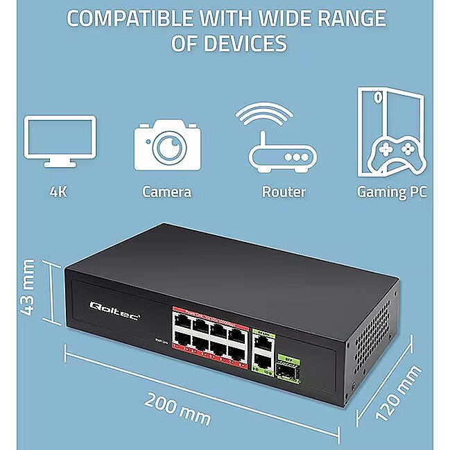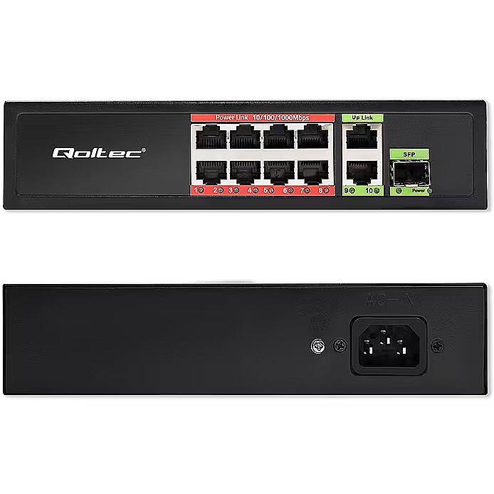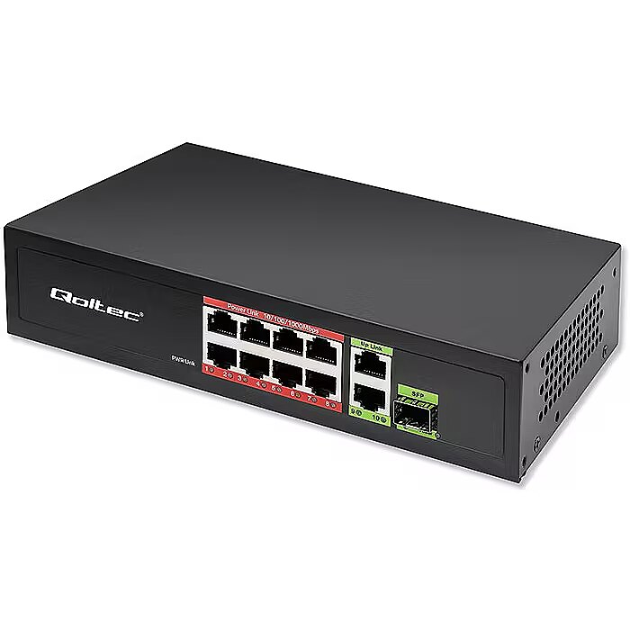 Discover new possibilities with a Qoltec device that offers: Compliant with IEEE 802.3af - offering up to 15.4W per port and up to 120W total output power for the entire switch, Automatic detection of PoE devices, SFP port for fiber optic connections, Data transmission speed up to 1Gb/s, Robust metal housing protects the electronics inside and allows for operation in more demanding conditions, Quiet operation thanks to passive cooling, Plug & Play - no configuration. Quiet operation, sturdy metal construction and instant installation