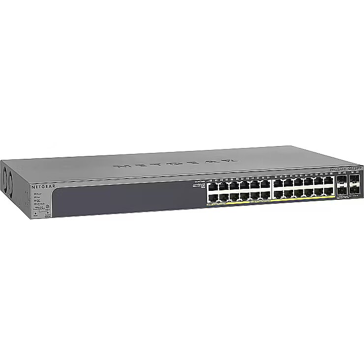 LongSummaryDescription - NETGEAR GS728TP. Slēdža tips: Pārvaldāms, Komutatora slānis: L2/L3/L4. Pamata komutācijas RJ-45 Ethernet pieslēgvietu tips: Pamata komutācijas RJ-45 Ethernet pieslēgvietu skaits: 24, USB 2.0 pieslēgvietu skaits: 24, USB 2.0 pieslēgvietu skaits: 1. MAC adrešu tabula: 16000 ierakstu, komutācijas jauda: 56 Gbit/s. Power over Ethernet (PoE). Uzstādīšana statīvā, formas faktors: 1U