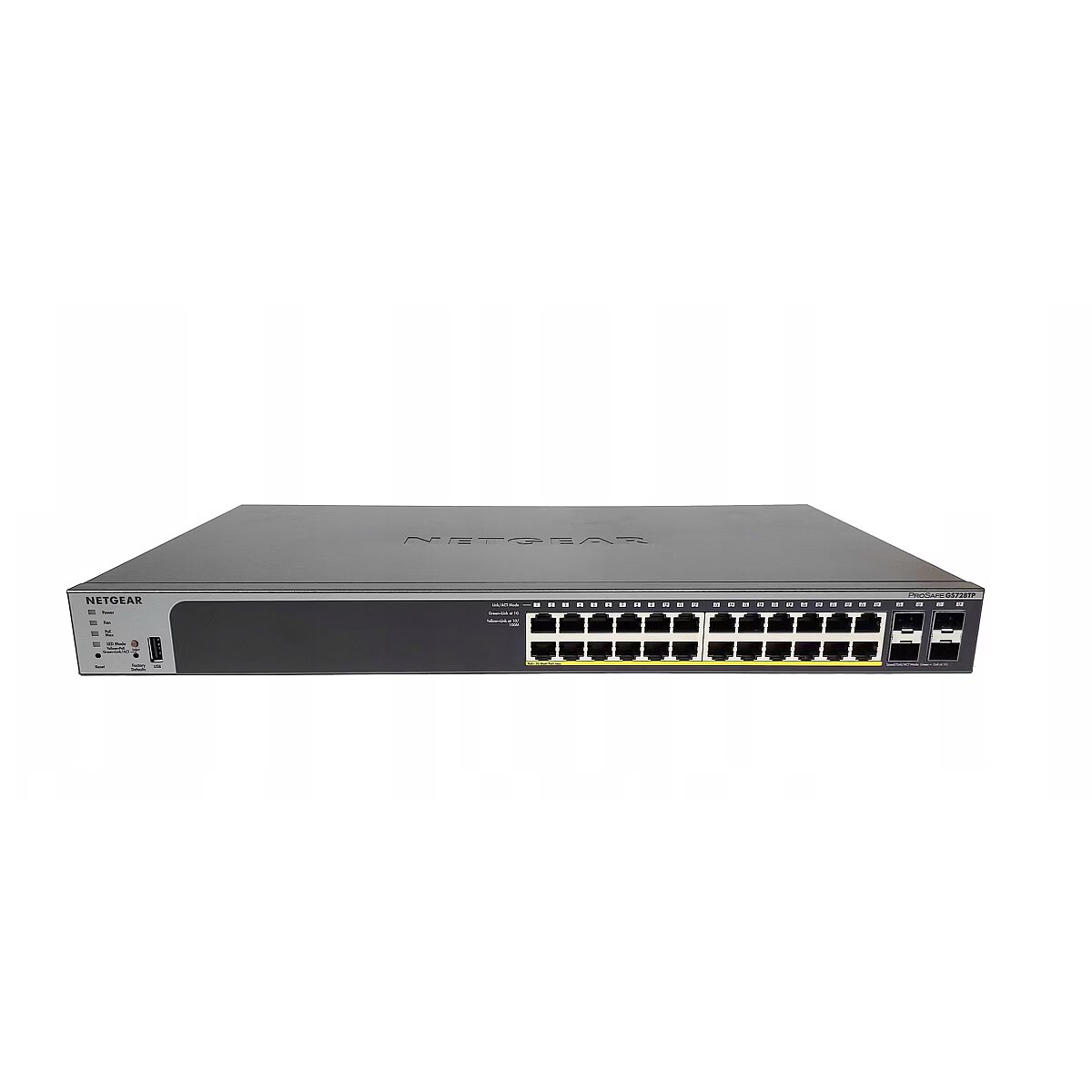 LongSummaryDescription - NETGEAR GS728TP. Switch type: Managed, Switch layer: L2/L3/L4. Basic switching RJ-45 Ethernet ports type: Gigabit Ethernet (10/100/1000), Basic switching RJ-45 Ethernet ports quantity: 24, USB 2.0 ports quantity: 1. MAC address table: 16000 entries, Switching capacity: 56 Gbit/s. Power over Ethernet (PoE). Rack mounting, Form factor: 1U