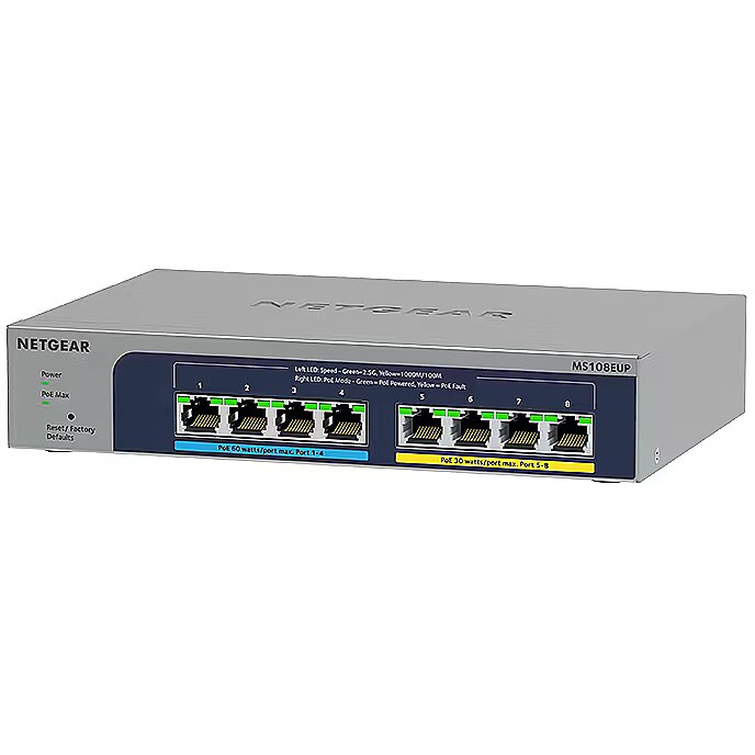 LongSummaryDescription - NETGEAR 8-port Ultra60 PoE++ Multi-Gigabit (2.5G) Ethernet Plus Switch. Switch type: Managed, Switch layer: L2/L3. Basic switching RJ-45 Ethernet ports type: 2.5G Ethernet (100/1000/2500), Basic switching RJ-45 Ethernet ports quantity: 8. Full duplex. MAC address table: 16000 entries, Switching capacity: 40 Gbit/s. Networking standards: IEEE 802.1Q, IEEE 802.1p, IEEE 802.3, IEEE 802.3ab, IEEE 802.3ad, IEEE 802.3af, IEEE 802.3at, IEEE.... Power over Ethernet (PoE)