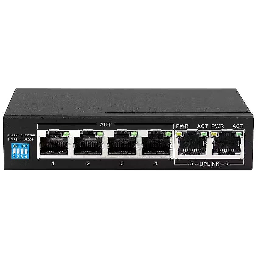 Extralink Krios to 6-portowy przełącznik niezarządzalny z 4 portami PoE o maksymalnej prędkości 1000 Mb/s oraz obsługą standardów IEEE 802.3af/at z maksymalną mocą na jeden port wynoszącą 30 W. Switch wyposażony jest również w 2 porty RJ45 bez opcji zasilania PoE, które mogą służyć jako porty uplink lub do podłączenia dodatkowych urządzeń, np. rejestratora wideo w zastosowaniach monitoringowych.