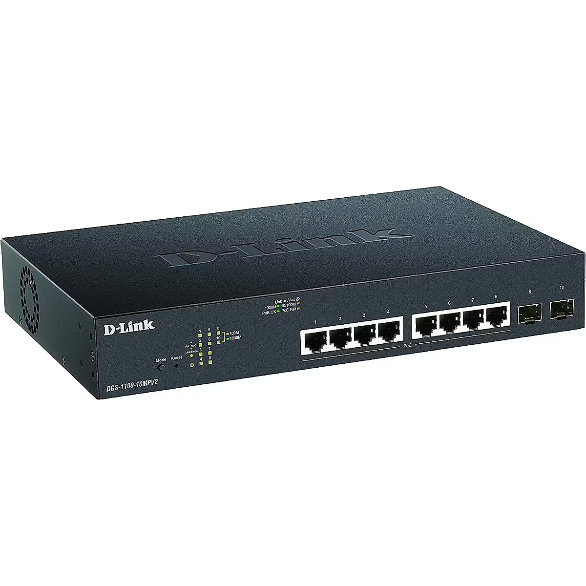 LongSummaryDescription - D-Link DGS-1100-10MPV2. Switch type: Managed, Switch layer: L2. Basic switching RJ-45 Ethernet ports type: Gigabit Ethernet (10/100/1000), Basic switching RJ-45 Ethernet ports quantity: 8. Full duplex. MAC address table: 8000 entries, Switching capacity: 20 Gbit/s. Networking standards: IEEE 802.1D, IEEE 802.1Q, IEEE 802.1p, IEEE 802.1w, IEEE 802.3, IEEE 802.3ab, IEEE 802.3ad, IEEE.... Power over Ethernet (PoE). Rack mounting, Form factor: 1U