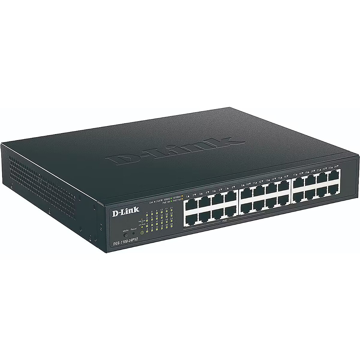 LongSummaryDescription - D-Link DGS-1100-24PV2. Switch type: Managed, Switch layer: L2. Basic switching RJ-45 Ethernet ports type: Gigabit Ethernet (10/100/1000), Basic switching RJ-45 Ethernet ports quantity: 24. Full duplex. MAC address table: 8000 entries, Switching capacity: 48 Gbit/s. Networking standards: IEEE 802.1AX, IEEE 802.1D, IEEE 802.1Q, IEEE 802.1p, IEEE 802.1w, IEEE 802.3, IEEE 802.3ab, IEEE.... Power over Ethernet (PoE). Rack mounting